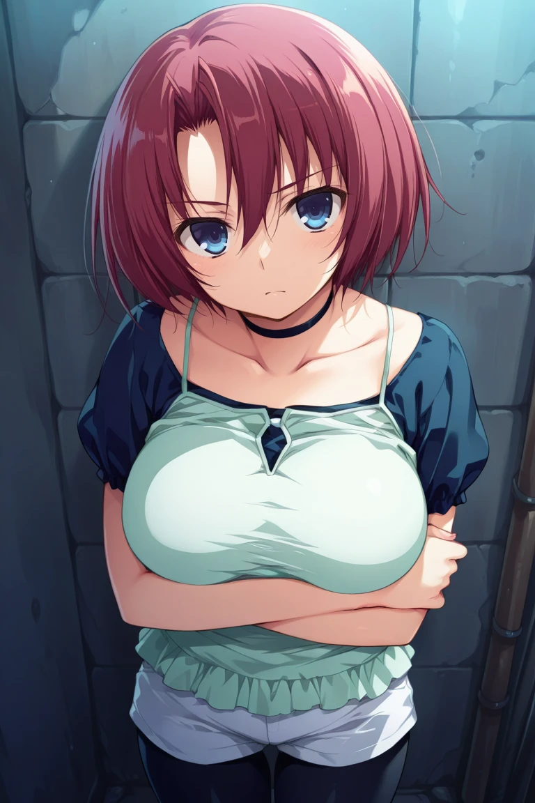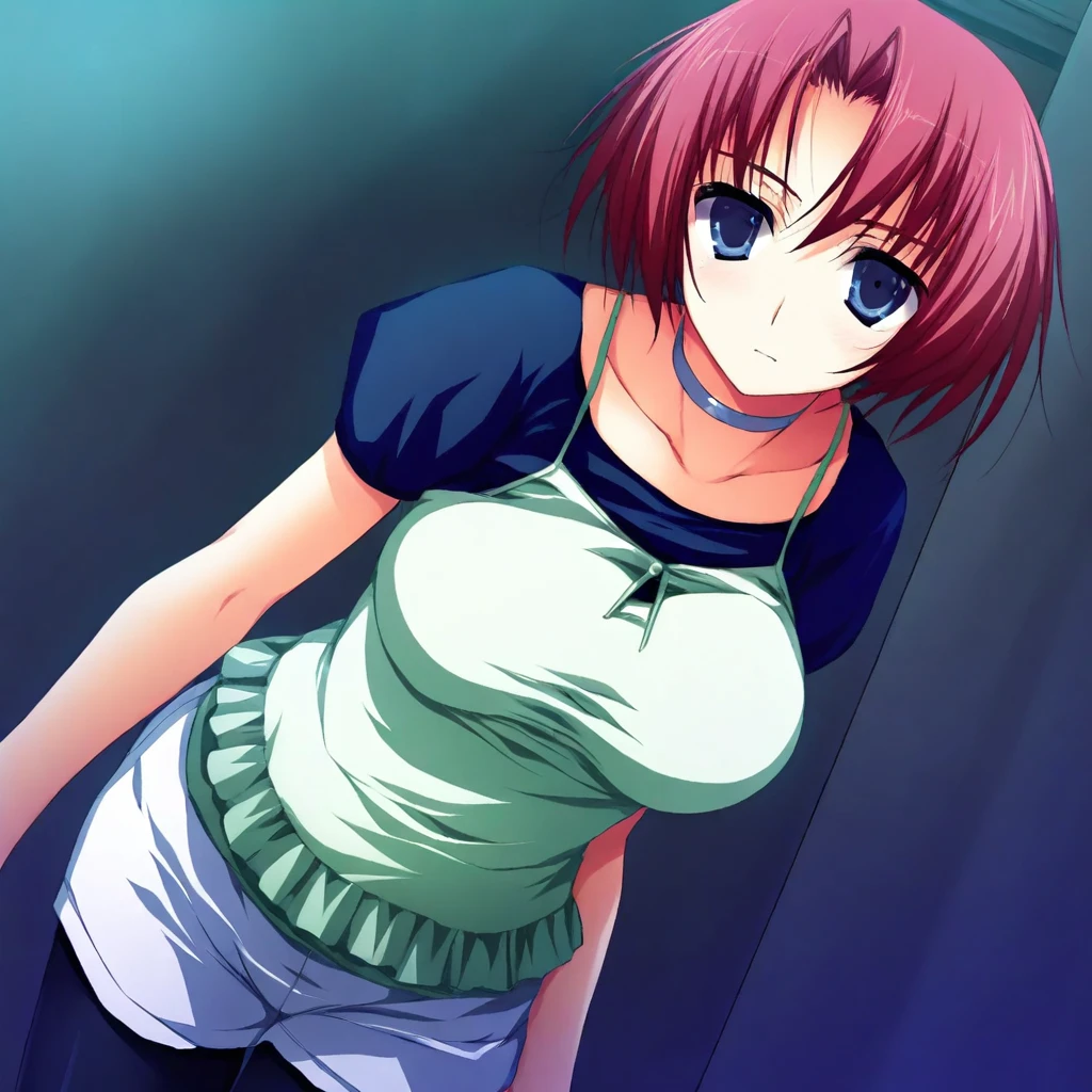anzu-oufit1, layered clothing, blue shirt, short sleeves, teal camisole, choker, white shorts, black leggings,
