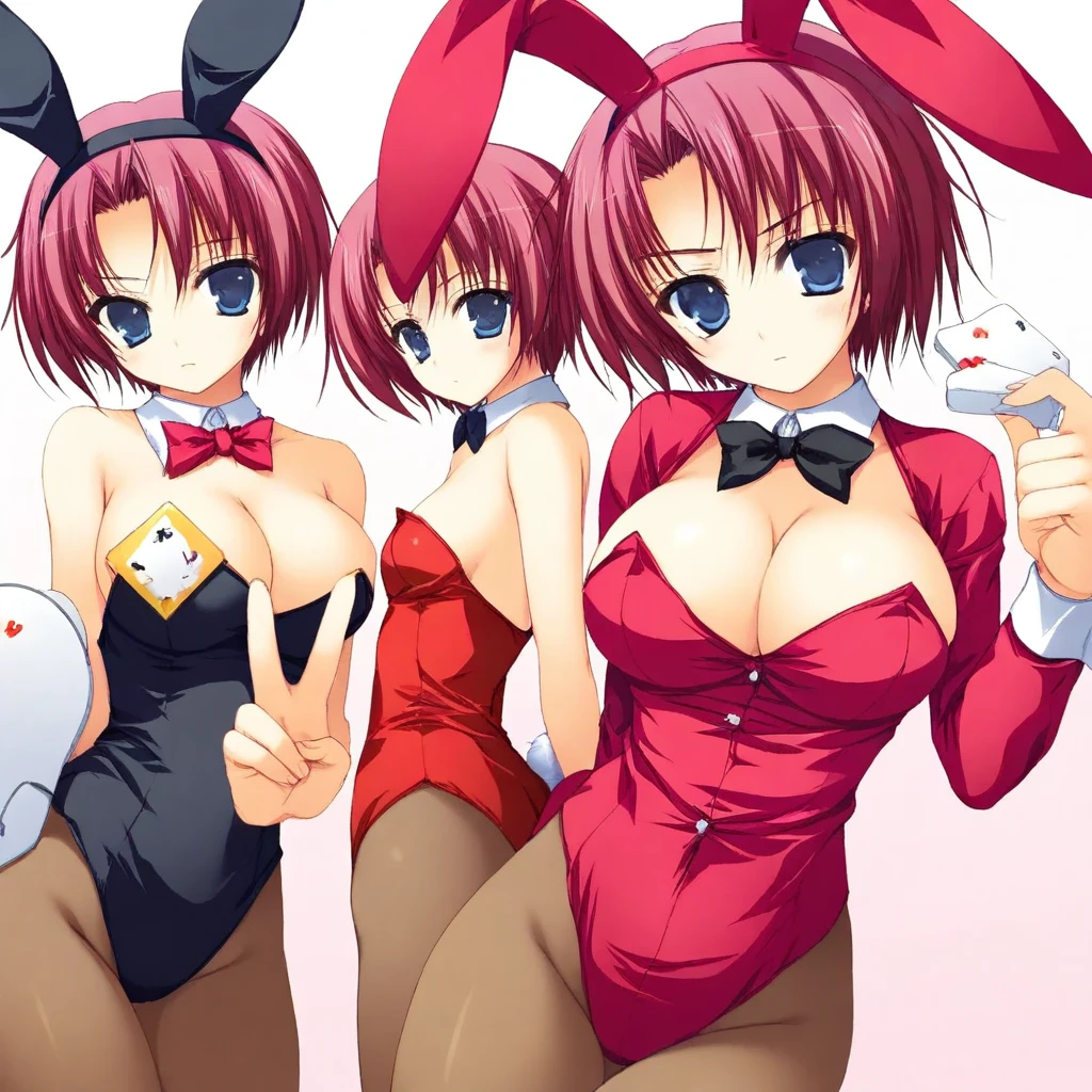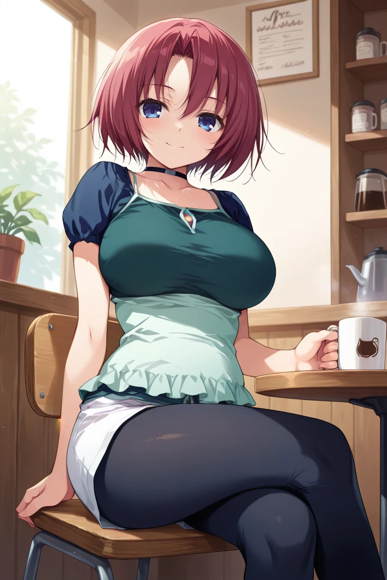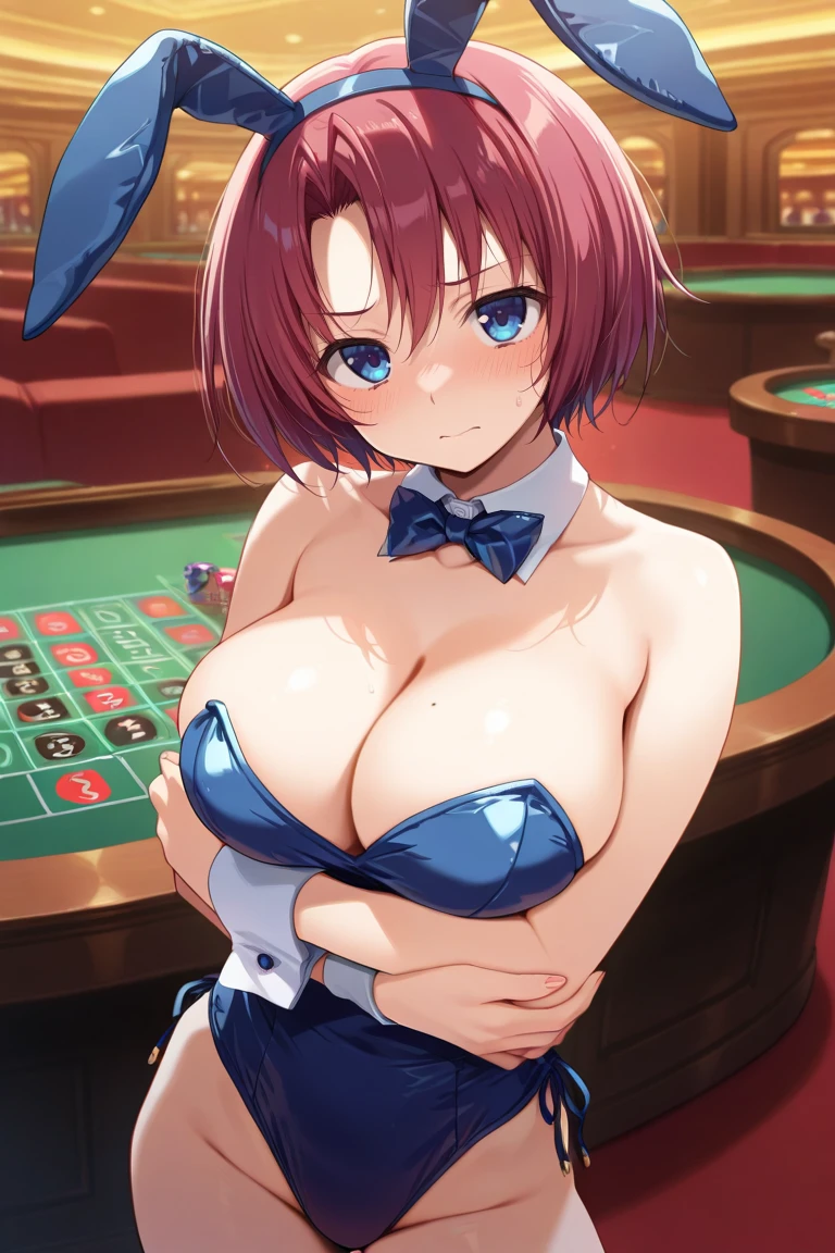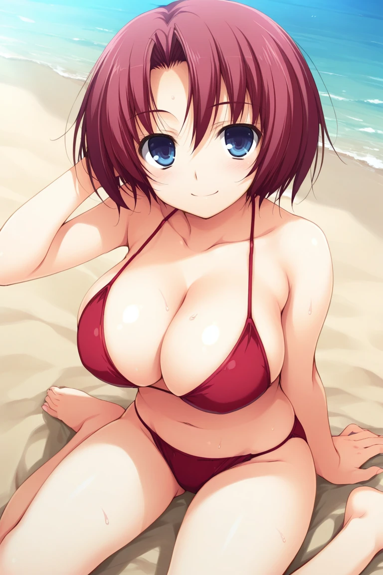 red hair, short hair, parted bangs, blue eyes, large breasts,