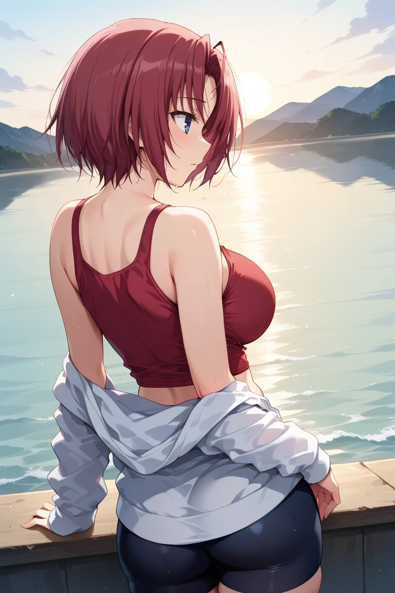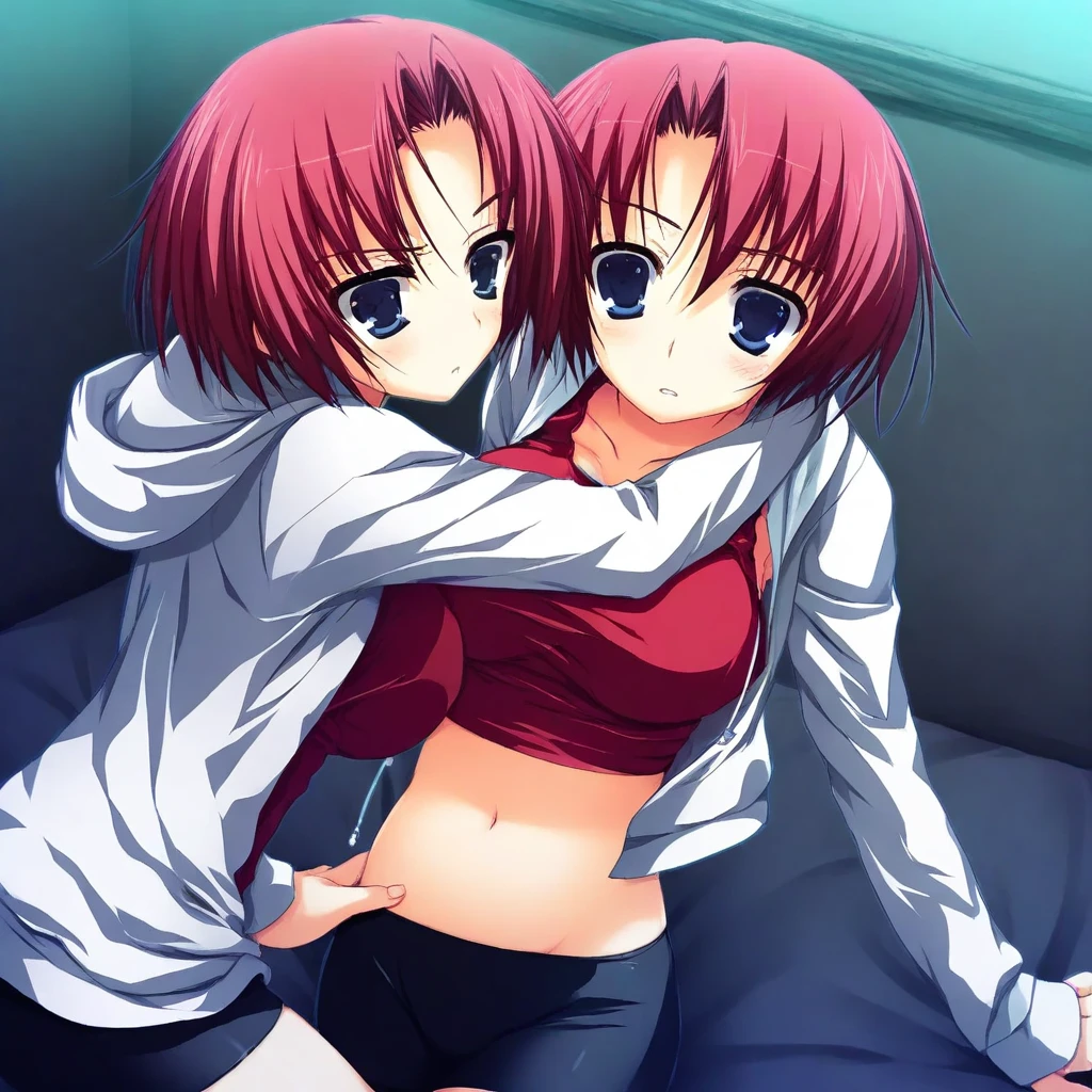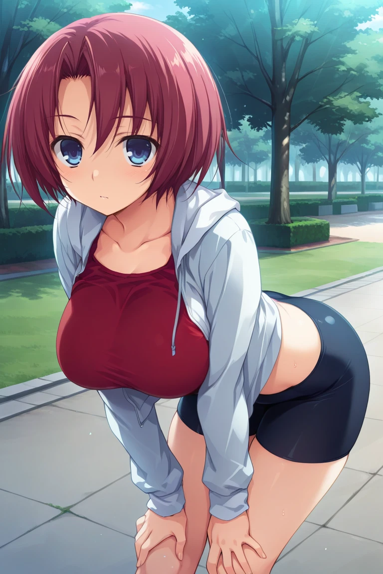 anzu-outfit2, red tank top, white hoodie, open hoodie, midriff, black spandex shorts,