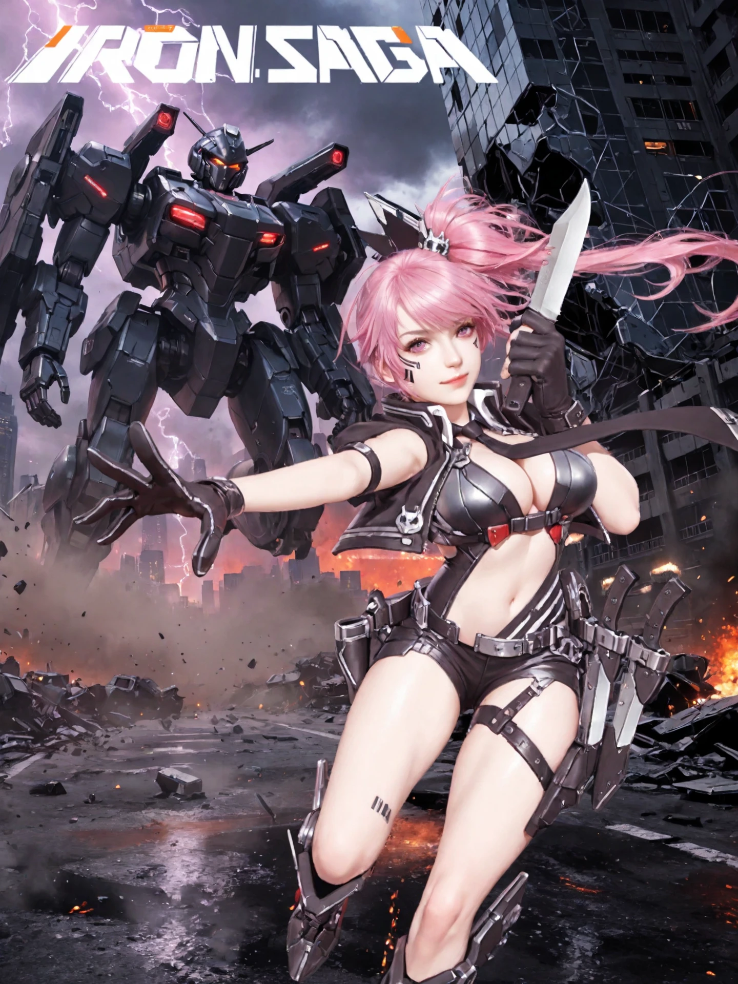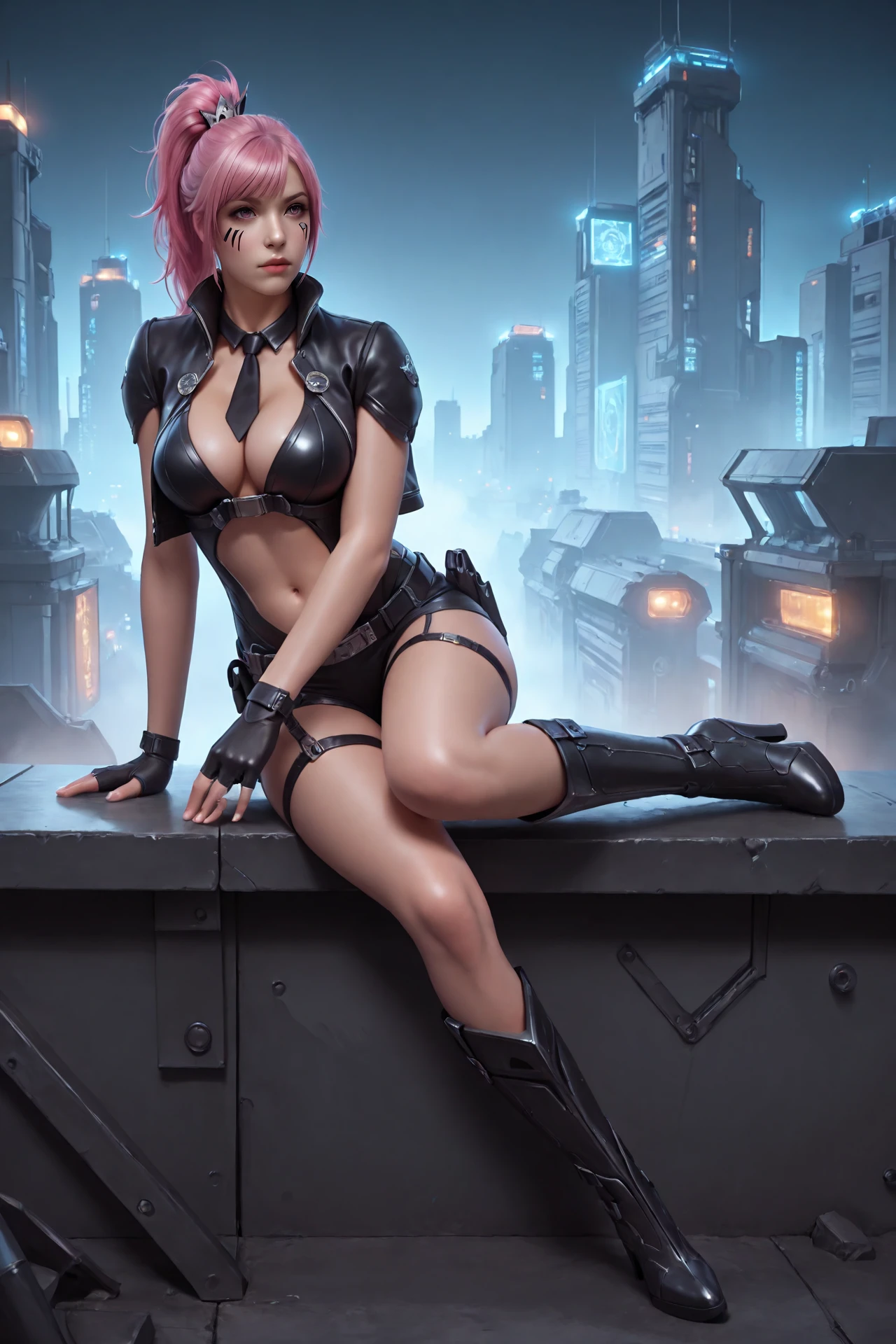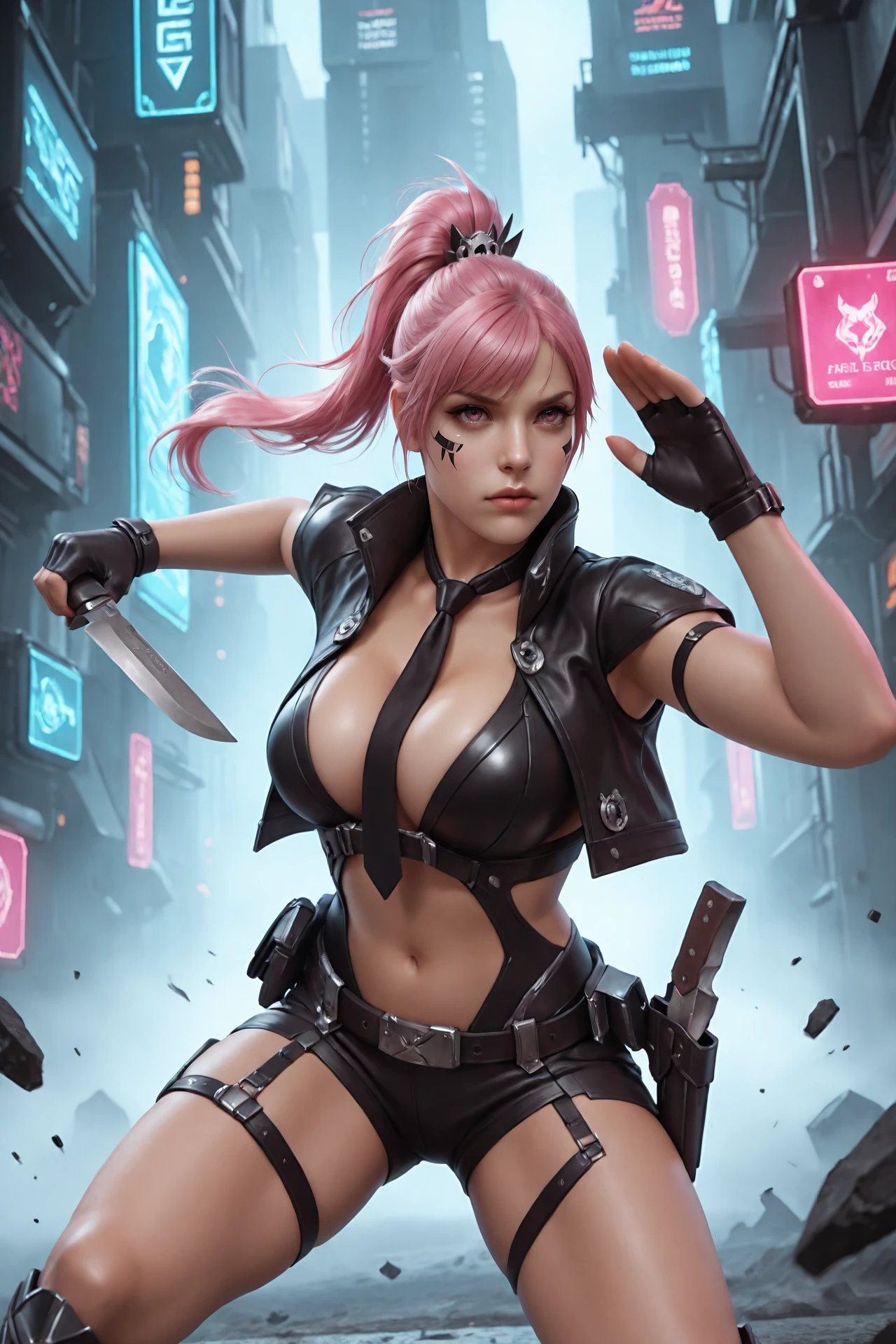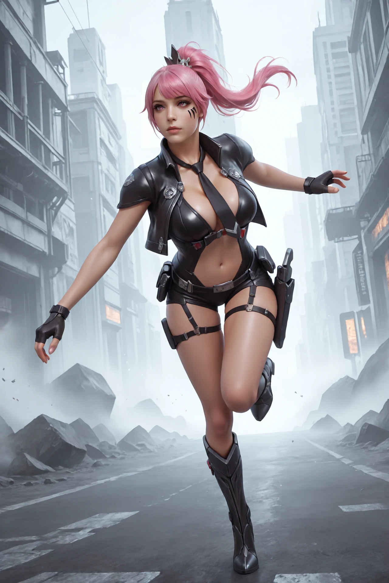 pink_hair,side_ponytail,hair_ornament,facepaint,bangs, large_breasts,cleavage,navel,open_jacket,center_opening,necktie,mechanical_trim, short jacket,leotard,fingerless_gloves,arm_belt,short_shorts,belt,holster,thigh_strap, mechanical_boots,knee_boots,high_heels,