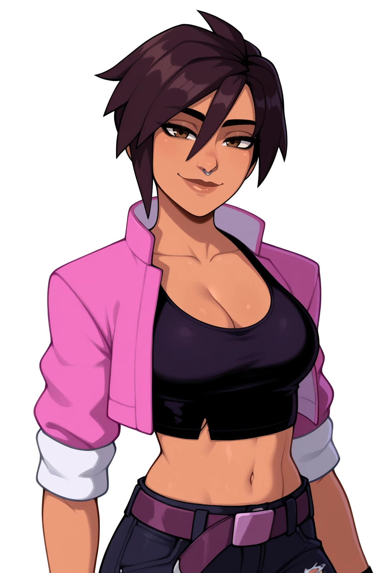 Basic prompts : 1girl, invisigal, short hair, brown eyes, hair between eyes, dark brown hair, dark skin, lips, nose piercing, tomboy