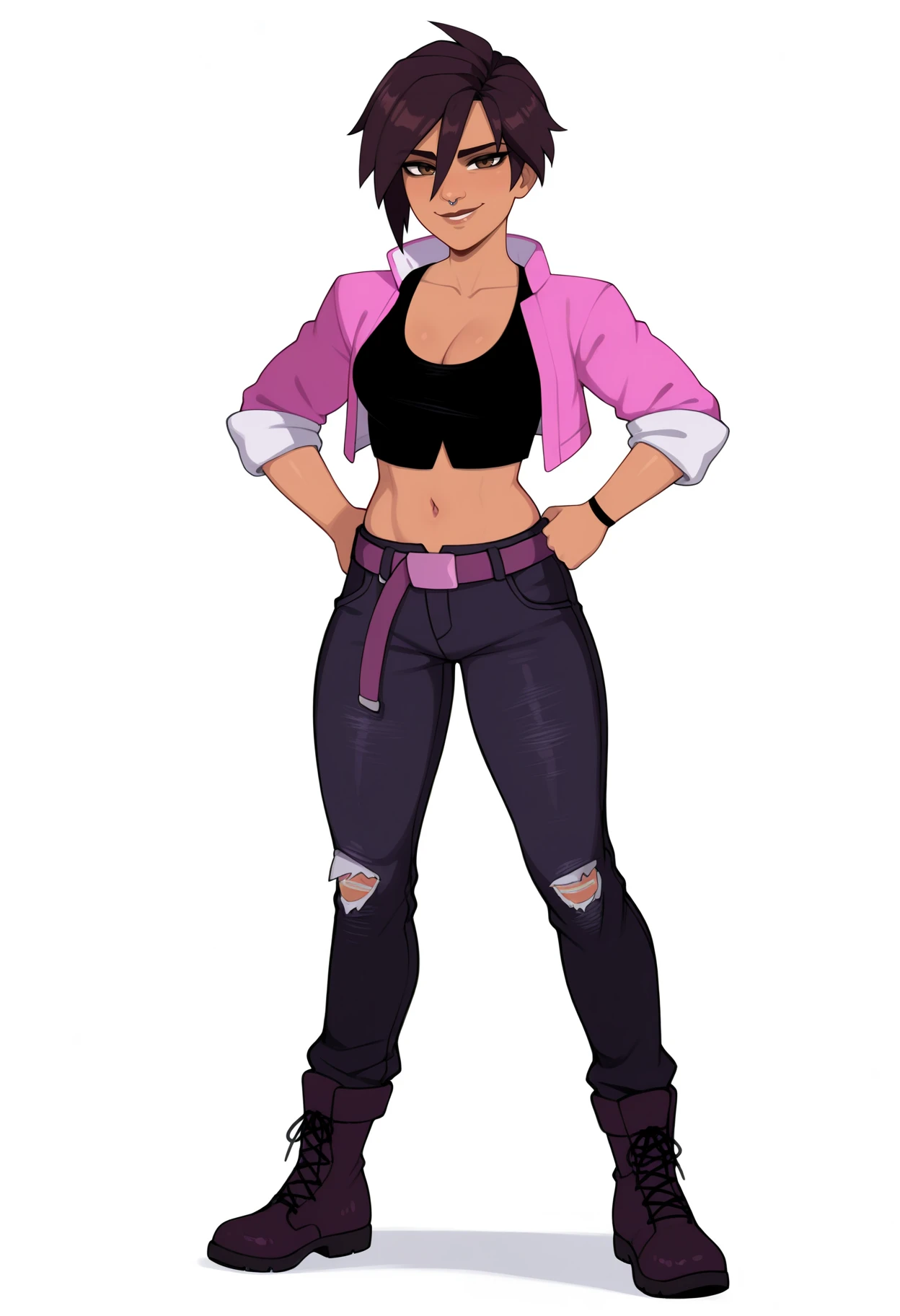 Outfit prompts : pink jacket, cropped jacket, open jacket, black crop top, black pants, denim pants, torn clothes, belt, black boots, cleavage, navel, midriff, collarbone