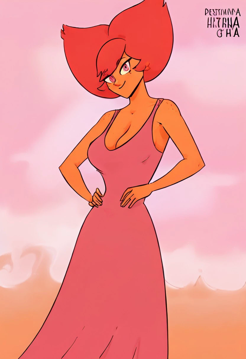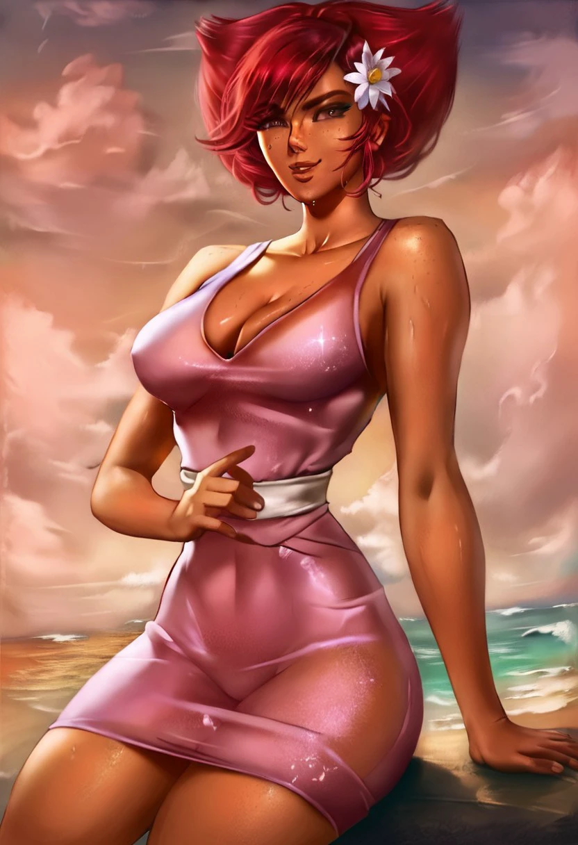 Hestia DLH, 1girl, solo, red hair, pink eyes, freckles, breasts, dress, cleavage, red hair, bangs, pink dress, colored skin, orange skin
