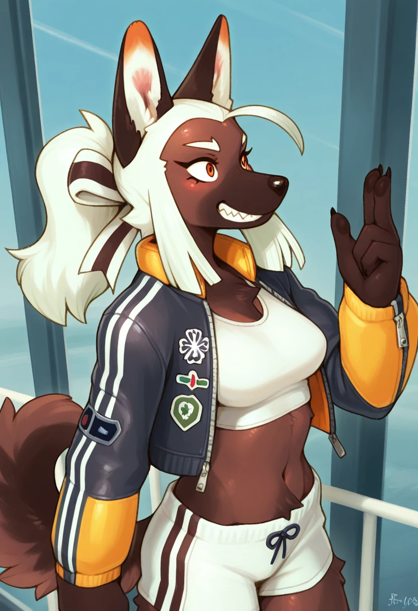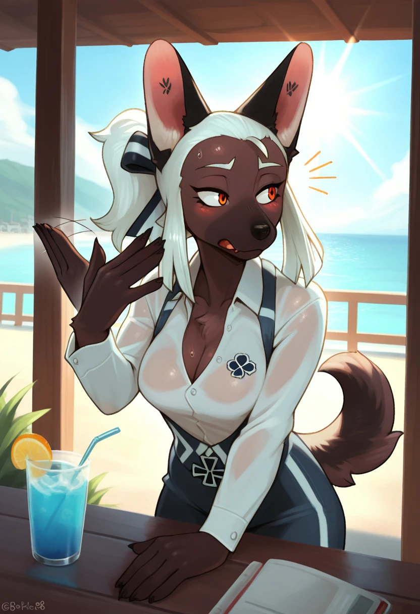 Supporting tags: dog girl, animal ears, furry female, tail, white hair, ponytail, medium breasts,