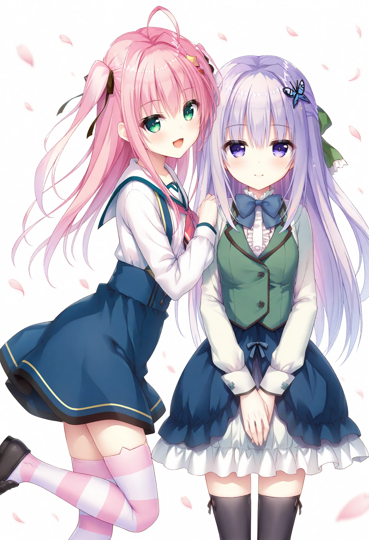 Houjou Sora,light purple hair,short hair,twin braids,hair bow,pom pom hair ornament,hair scrunchie,yellow eyes,Houjou Hana,light brown hair,short hair,one side up,hair scrunchie,twin braids,flower hairpin,yellow eyes,https://civitai.com/models/2494394/ichinose-nana-or-select-oblige-or-noobai