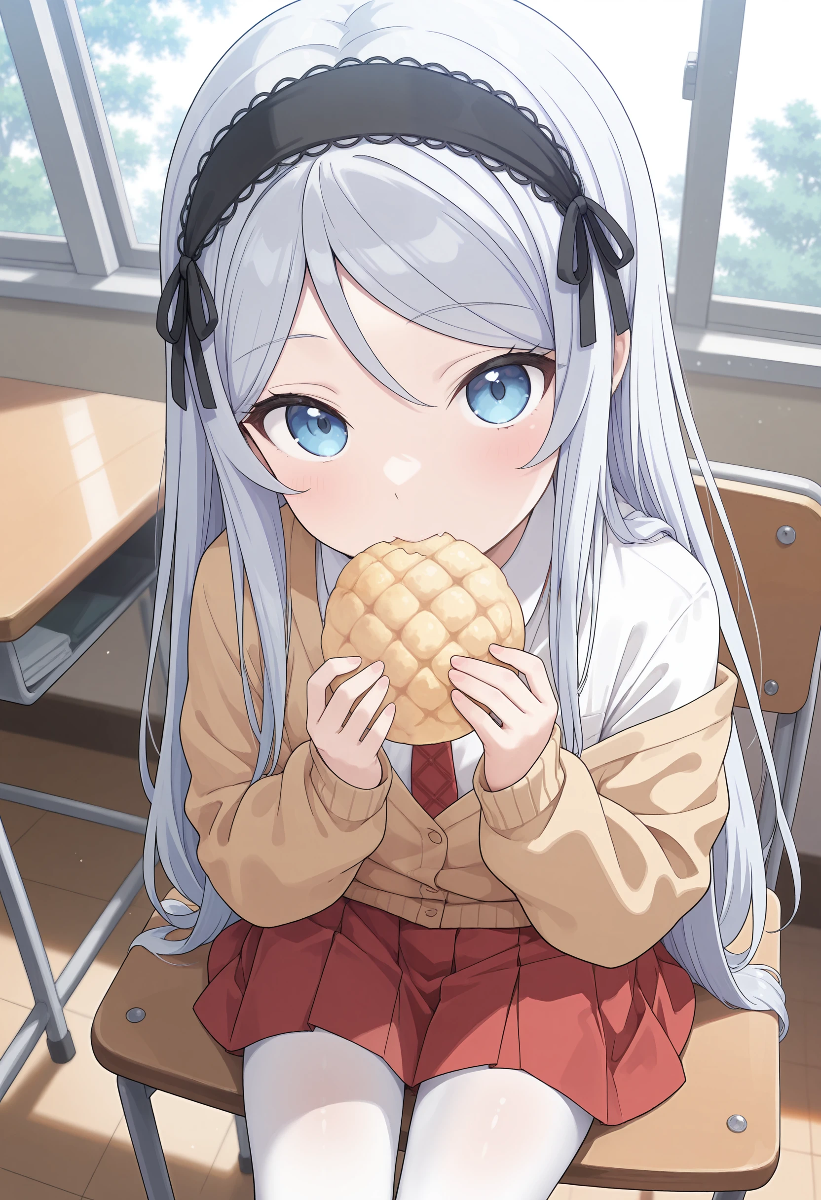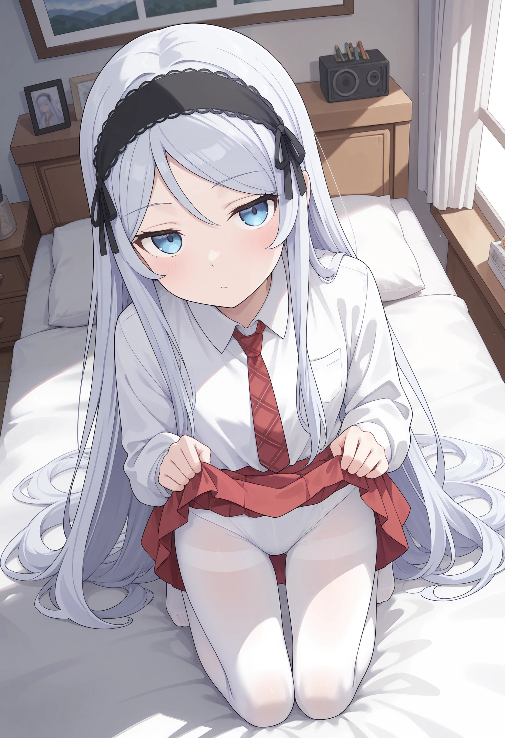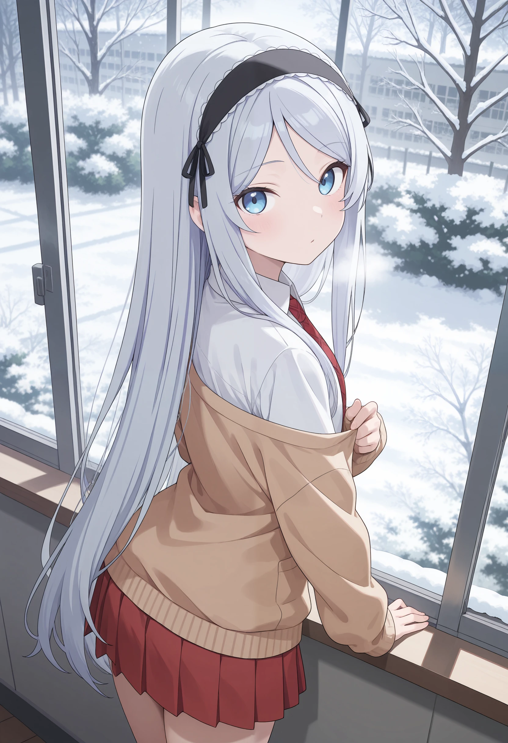 outfit: school uniform,white shirt,red necktie,cardigan,sleeves past wrists,off shoulder,red pleated skirt,white pantyhose,loafers