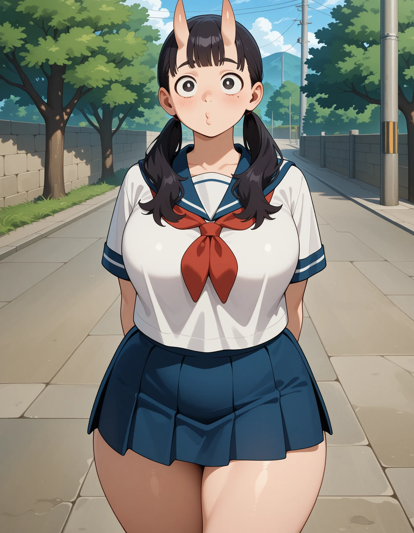 inutade, long hair, low twintails, black eyes, black hair, bright pupils, mole under eye, very tall female,