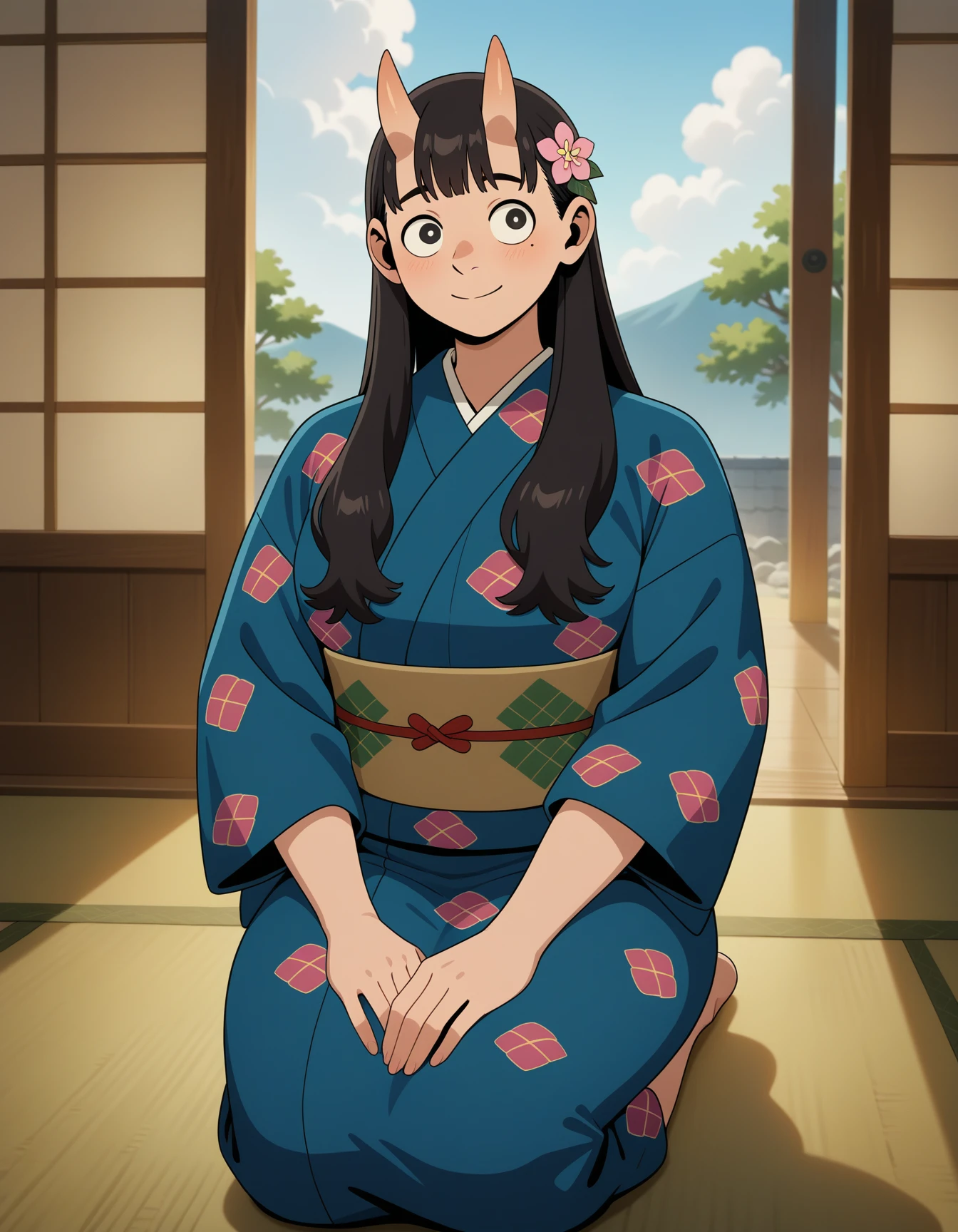 Appearance: inutade, long hair, low twintails, black eyes, black hair, bright pupils, mole under eye, very tall female,