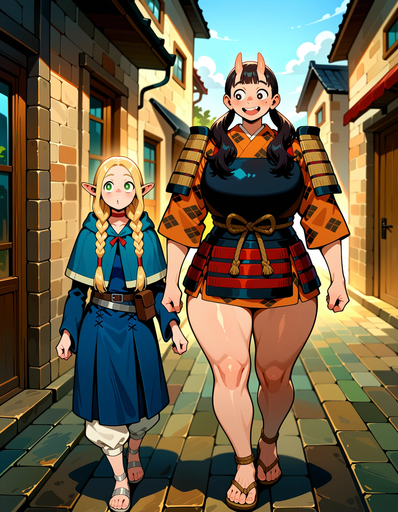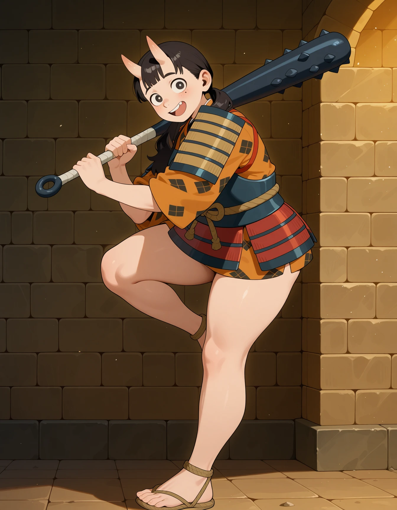 Optional Prompts: chipped tooth, asymmetrical tooth, holding weapon, kanabou, over shoulder, fundoshi, dungeon meshi, anime screencap, height difference, size difference