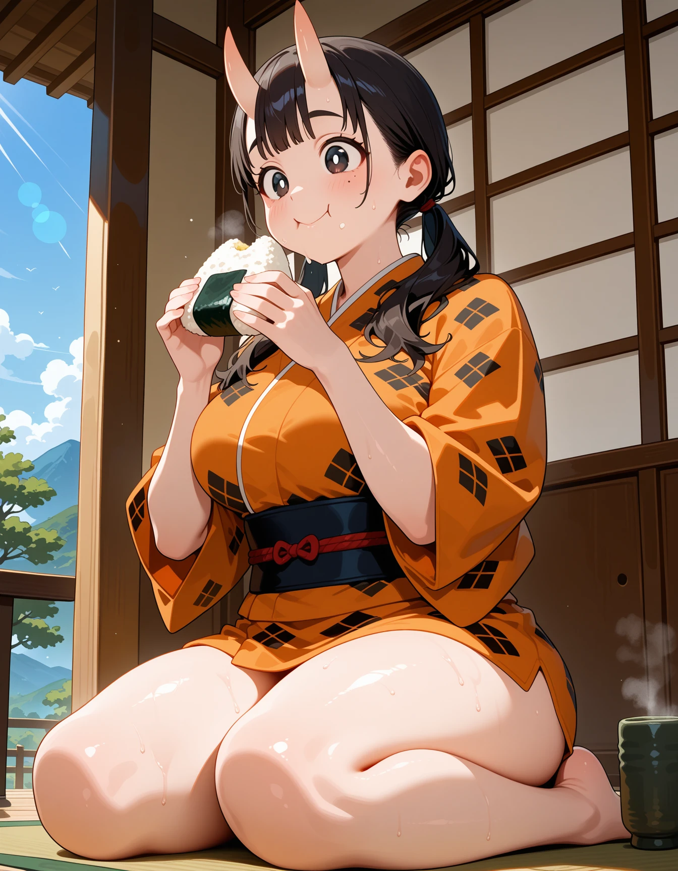 orange short kimono, black pattern, pattern kimono, thighs,