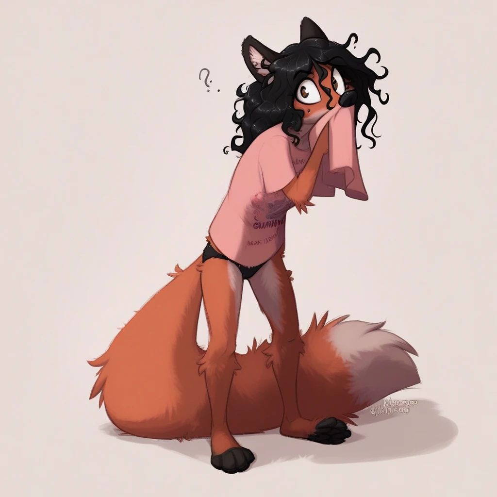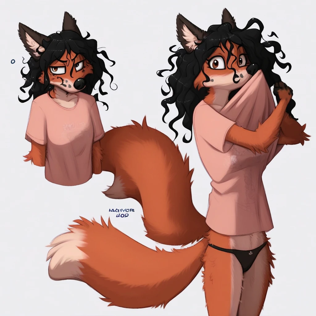 Red fox, vixen, orange and white fur, black hair, messy hair, black pawpads, black eyes, slim figure, small breasts,
