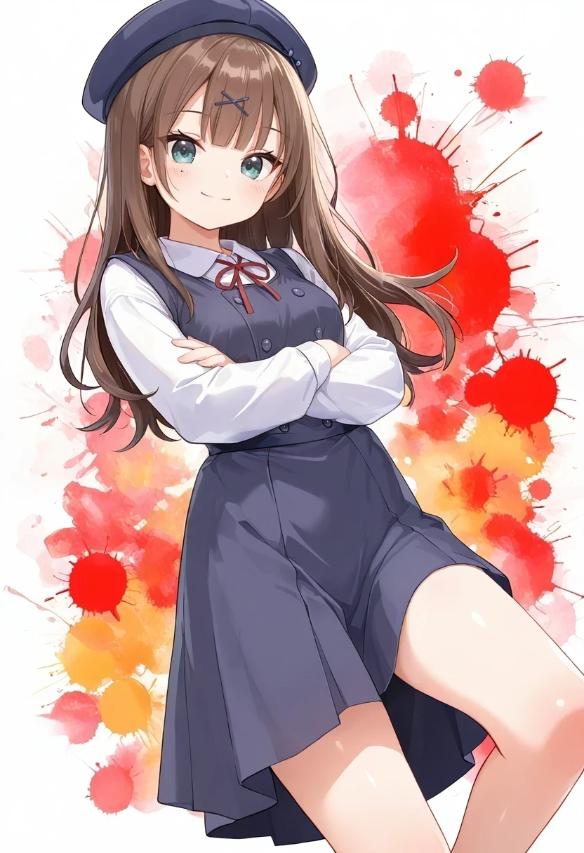 beret,x hair ornament,red neck ribbon,white shirt,long sleeves,school uniform,pinafore dress,blue dress,Casual: