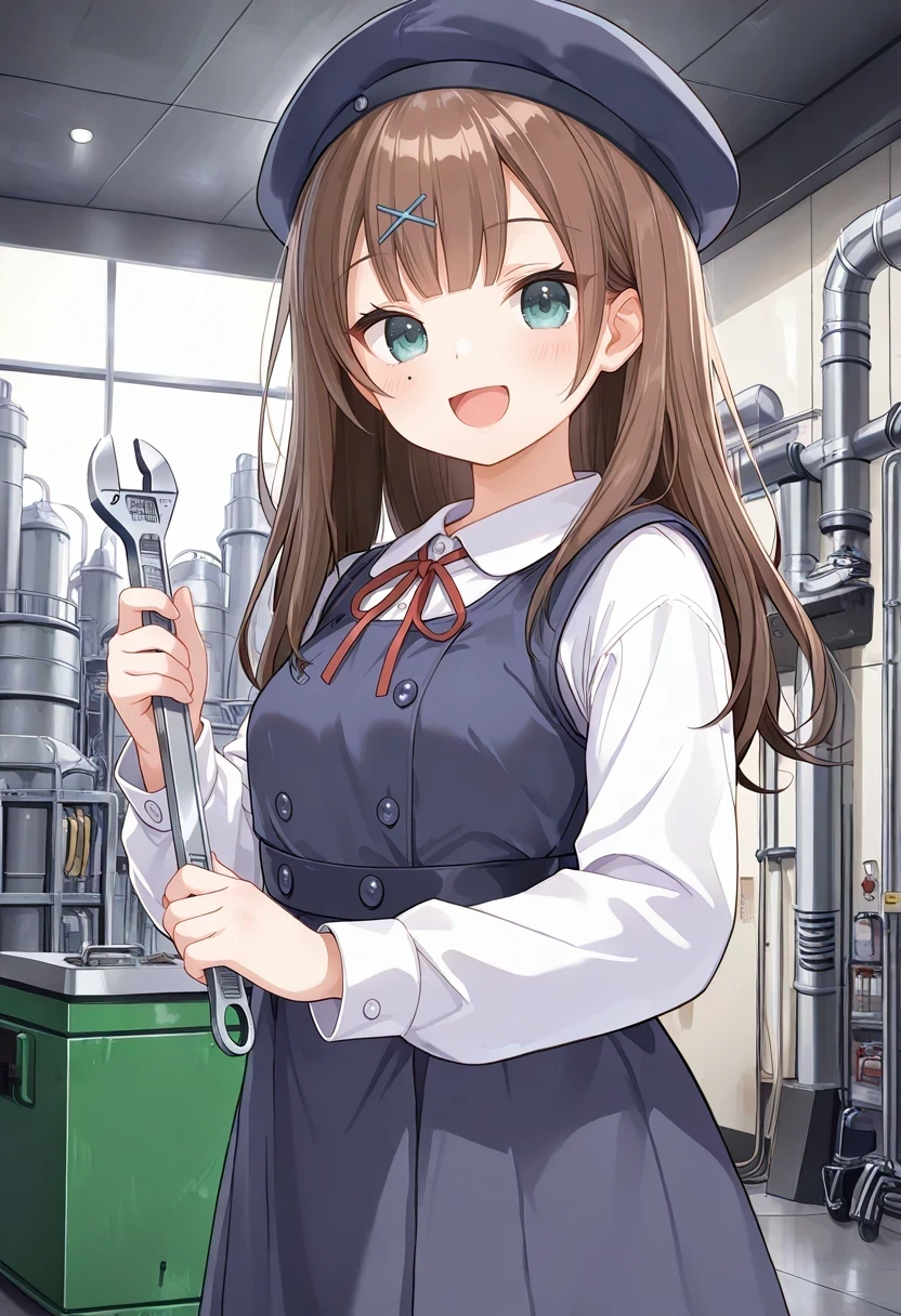 beret,x hair ornament,red neck ribbon,white shirt,long sleeves,school uniform,pinafore dress,blue dress,