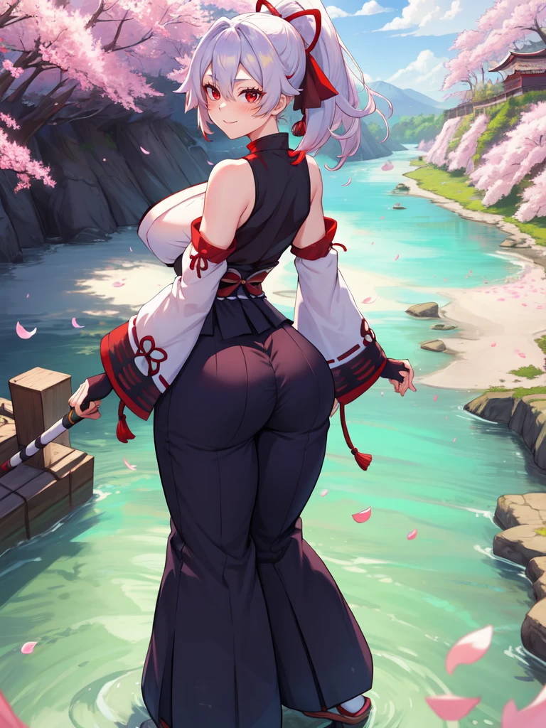 Defualt Outfit: "short kimino, (white kimino),(white sleeves), black undershirt, sleeveless turtleneck, (asymmetrical sleeves), hakama, (blue hakama pants), japanese clothes, (red fingerless gloves), detatched sleeves, single sleeve, (hip vent),"
