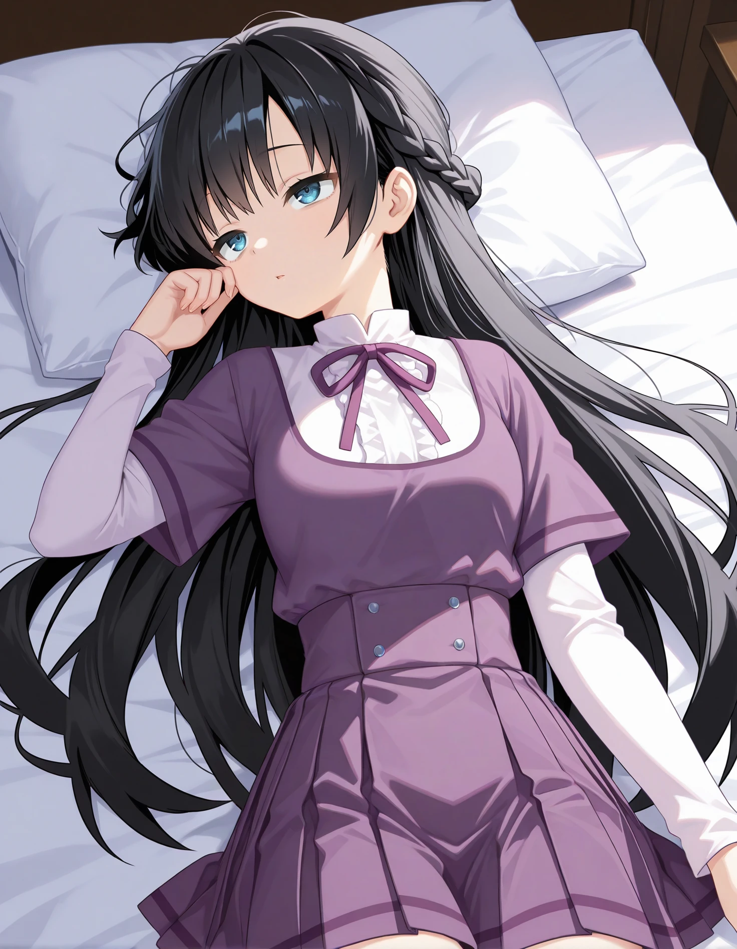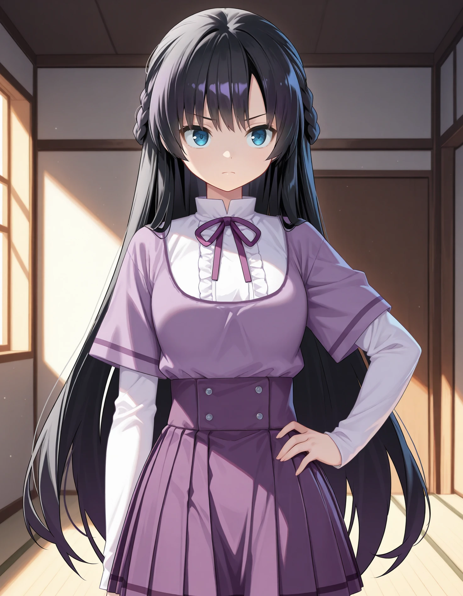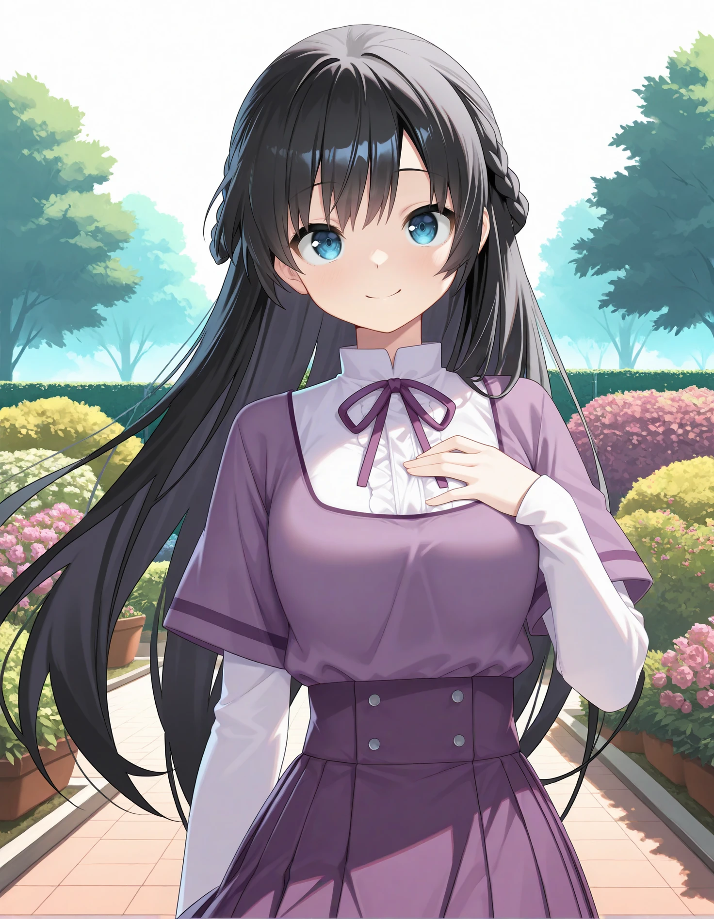 mgrcmayukozue, mayucsl, black hair, long hair, blue eyes, half up braid, white shirt, (white frills:0.7), high collar, purple neck ribbon, short over long sleeves, white sleeves, purple dress, purple pleated skirt
