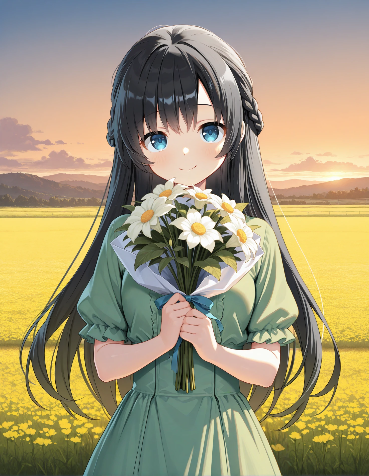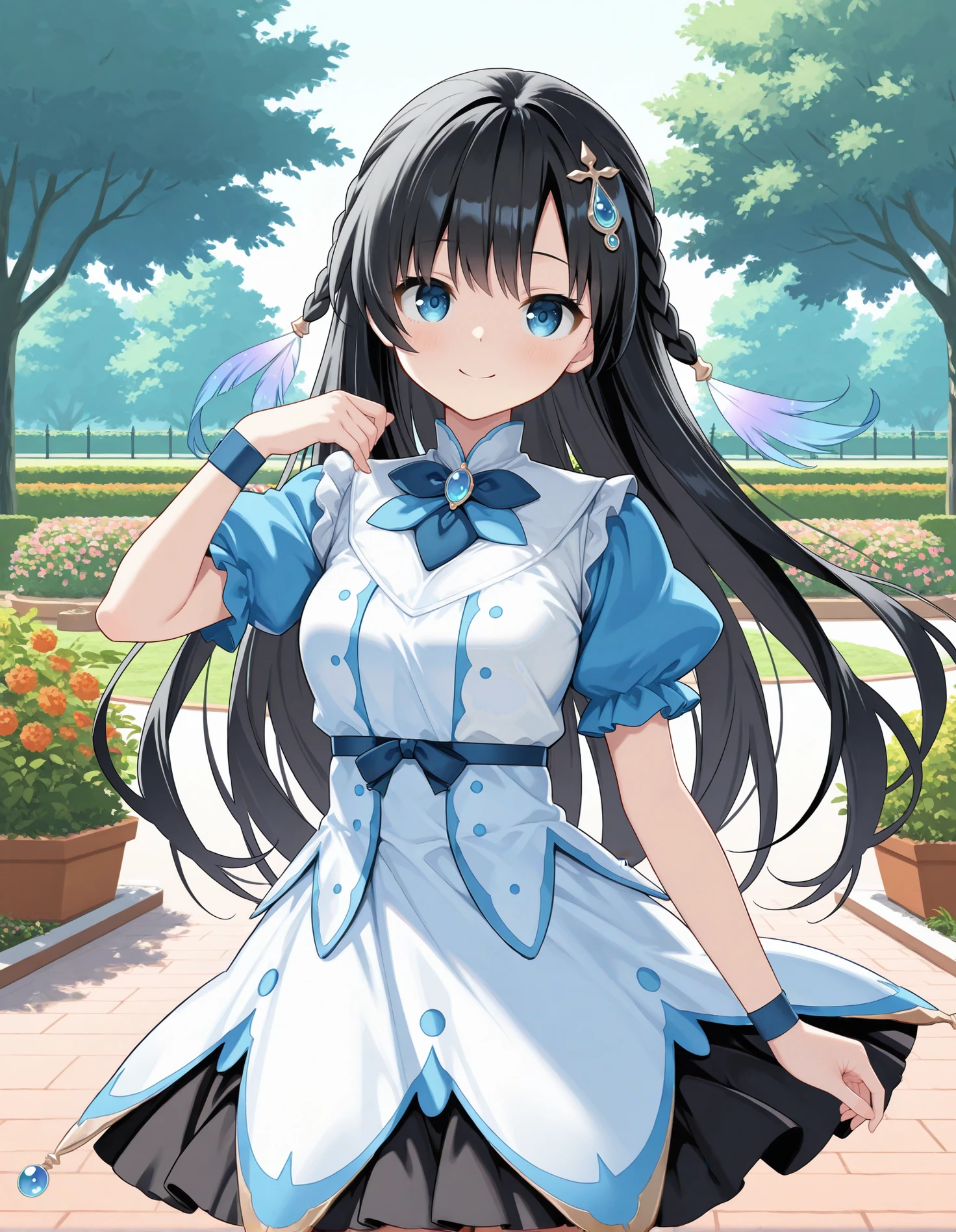 mgrcmayukozue, mayumgc, black hair, long hair, blue eyes, side braids, blue gem hairpin, feather hairclips, white dress, (white frills:0.9), blue ascot, blue neck gem, blue belt with bow, blue juliet sleeves, blue wrist wraps, black skirt under dress
