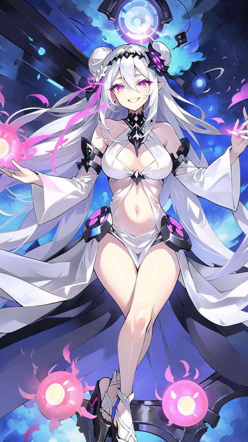 1girl, solo, white hair, abyssal ship, long hair, high heels, flower, breasts, navel, glowing, blue fire, detached sleeves, abyssal ship, hair ornament, pink eyes, pale skin, hair bun, glowing eye, dress, white dress, smile, white skin, <lora:EmpressIIIV1:0.7>, EmpressIII, sitting,