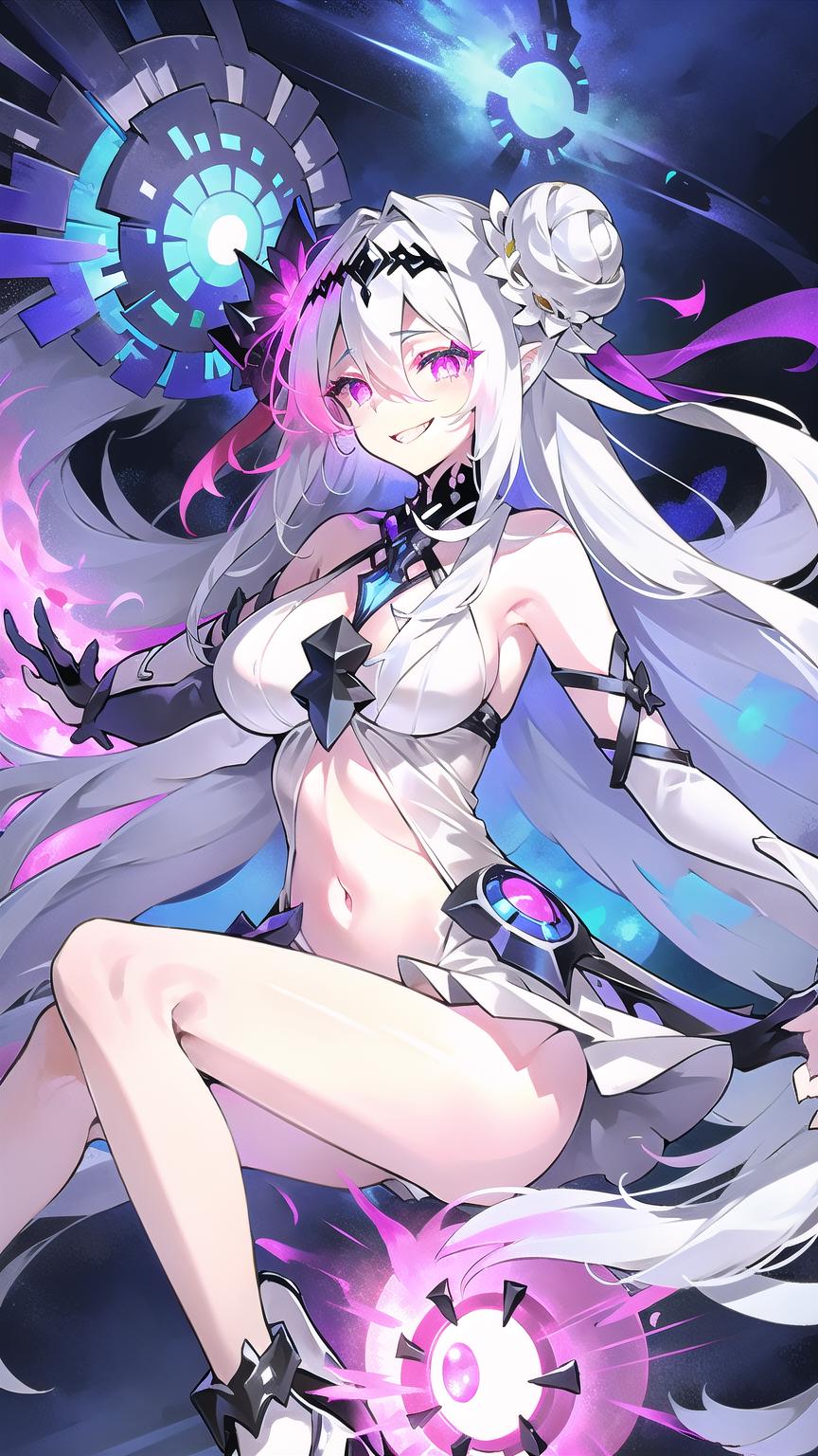 -->プロンプト:EmpressIII, abyssal ship, hair ornament, pink eyes, pale skin, hair bun, glowing eye, dress, white dress, high heels, flower, breasts,