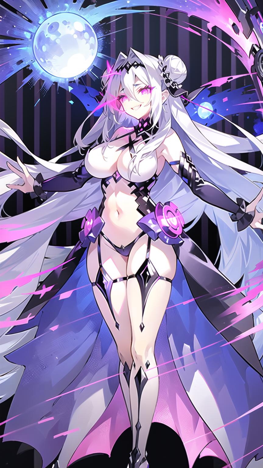 -->提示: EmpressIII, abyssal ship, hair ornament, pink eyes, pale skin, hair bun, glowing eye, dress, white dress, high heels, flower, breasts,