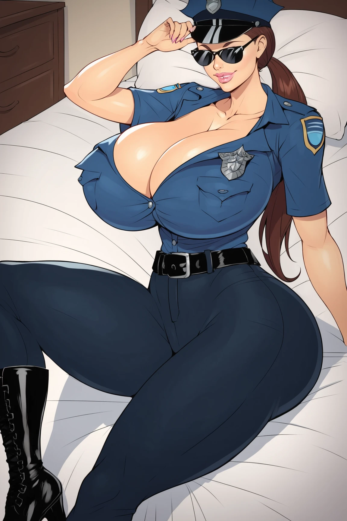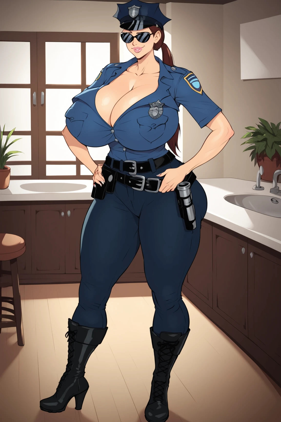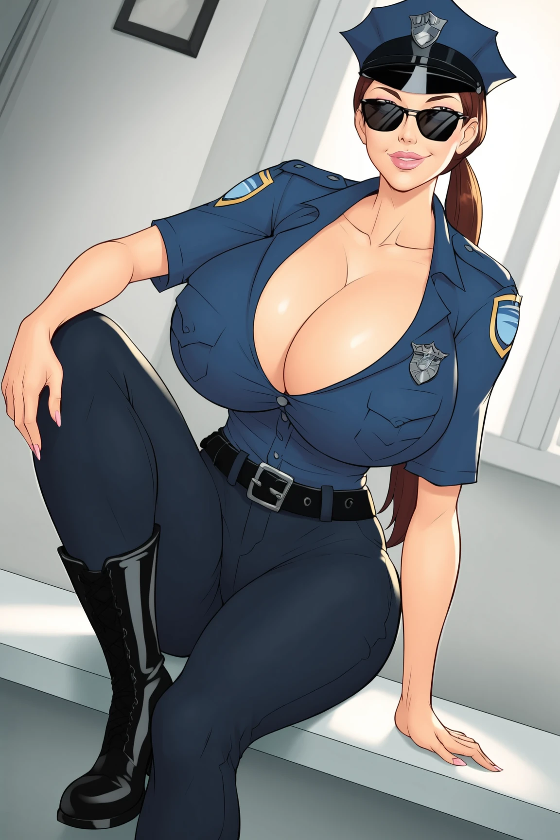 JasmineJuggsMFGXL, mature female, brown eyes, brown hair, ponytail, long hair, police hat, black sunglasses, huge breasts, collarbone, cleavage, police uniform, blue shirt, short sleeves, black belt, blue pants, black boots