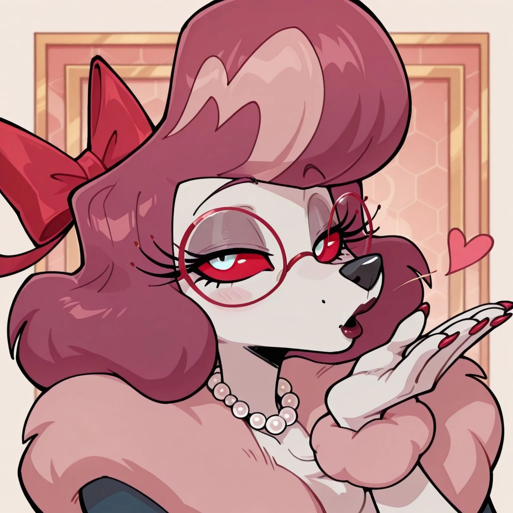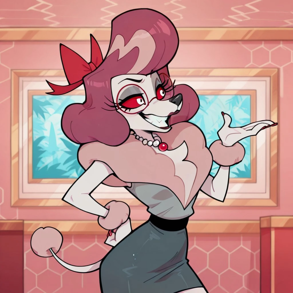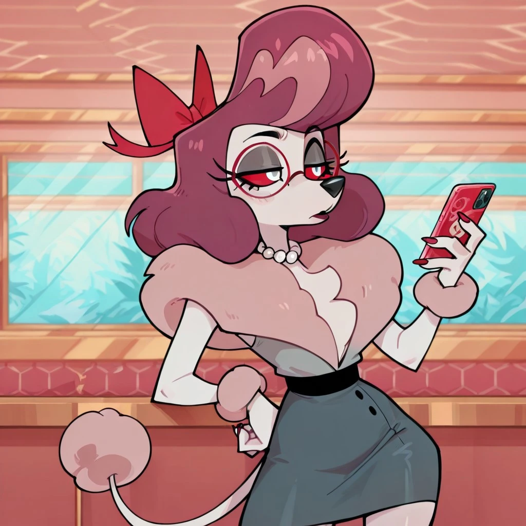poodle hellhound female, solo, curvy, white fur, pointy black nose, red sclera, white eyes, large dark red glasses, long eyelashes, dark red lipstick, dark pink hair, dark pink bouffant hair, dull pink neck puffy neck fur, dull pink wrist fur puff, thin white tail with dull pink fur puff, white poodle tail with dull pink accents, long red nails, gray sleeveless dress, dark gray straight skirt, pearl necklace, black belt,