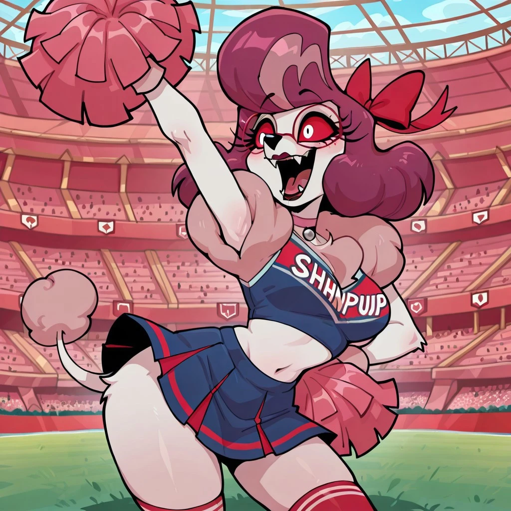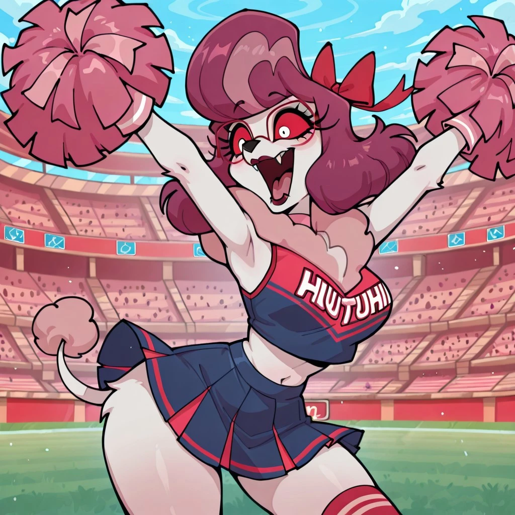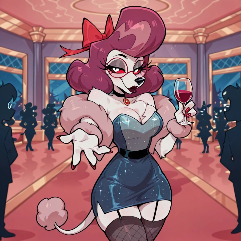 poodle hellhound female, solo, curvy, white fur, pointy black nose, red sclera, white eyes, large dark red glasses, long eyelashes, dark red lipstick, dark pink hair, dark pink bouffant hair, dull pink neck puffy neck fur, dull pink wrist fur puff, thin white tail with dull pink fur puff, white poodle tail with dull pink accents, long red nails, gray sleeveless dress, dark gray straight skirt, pearl necklace, black belt,
