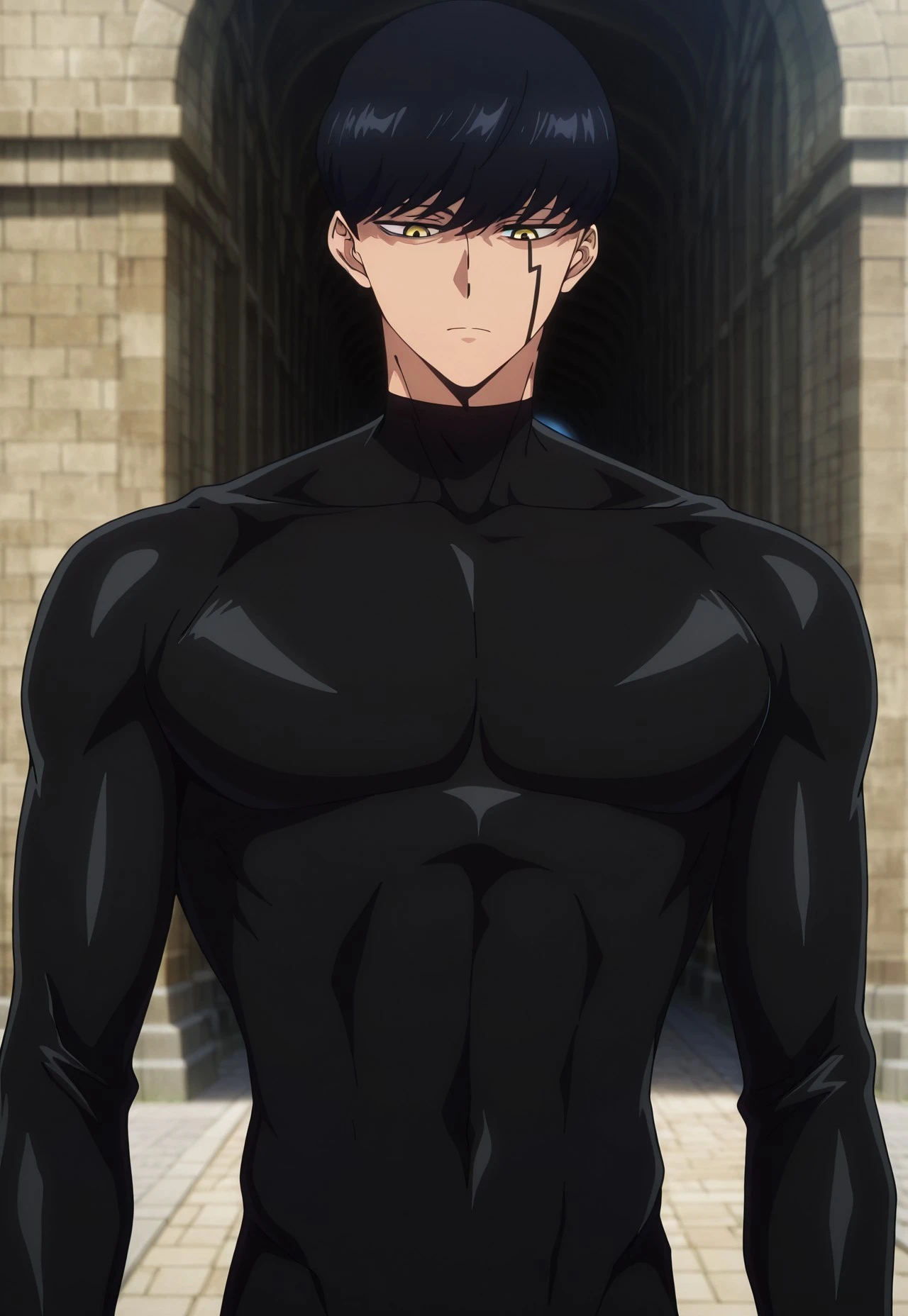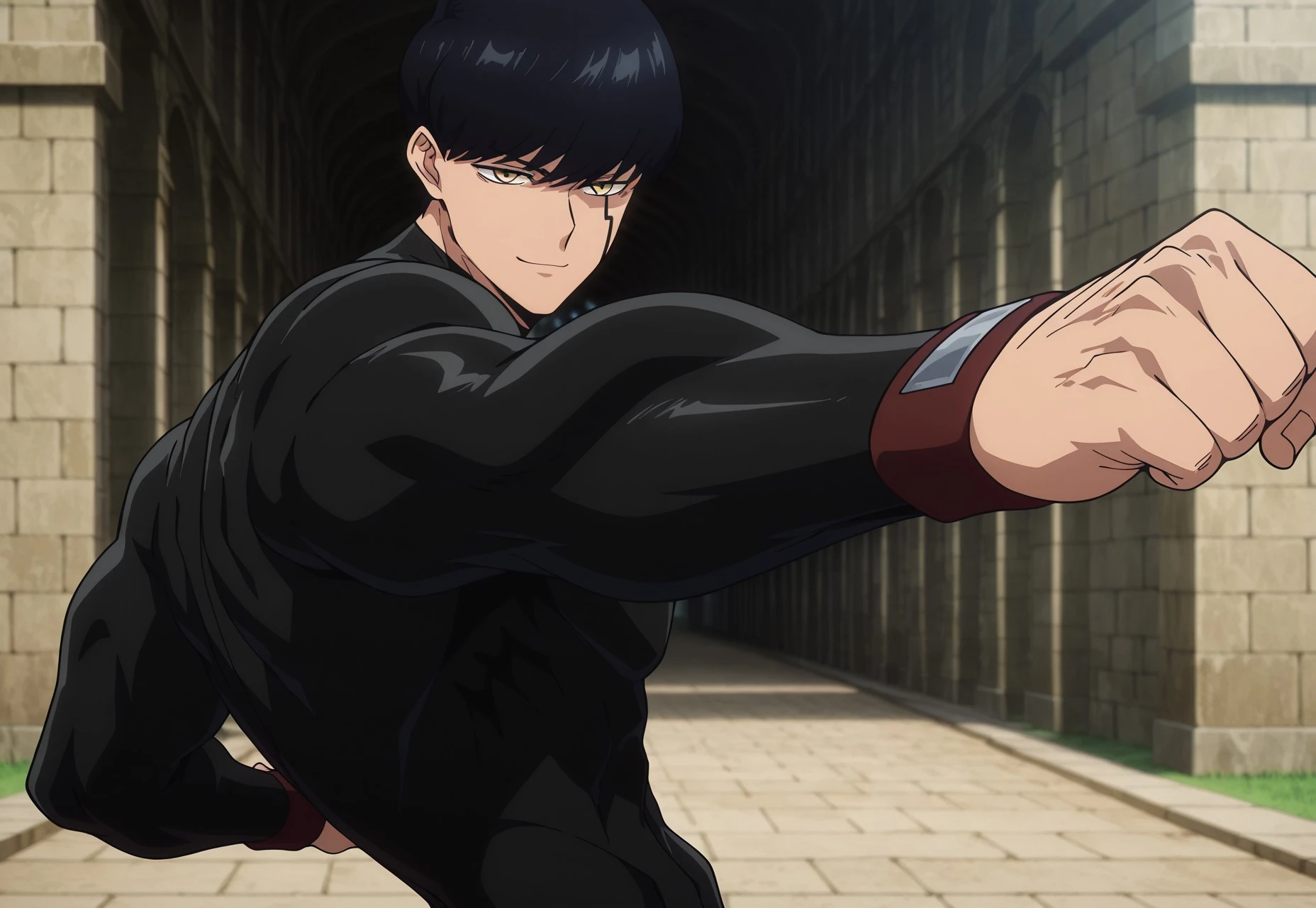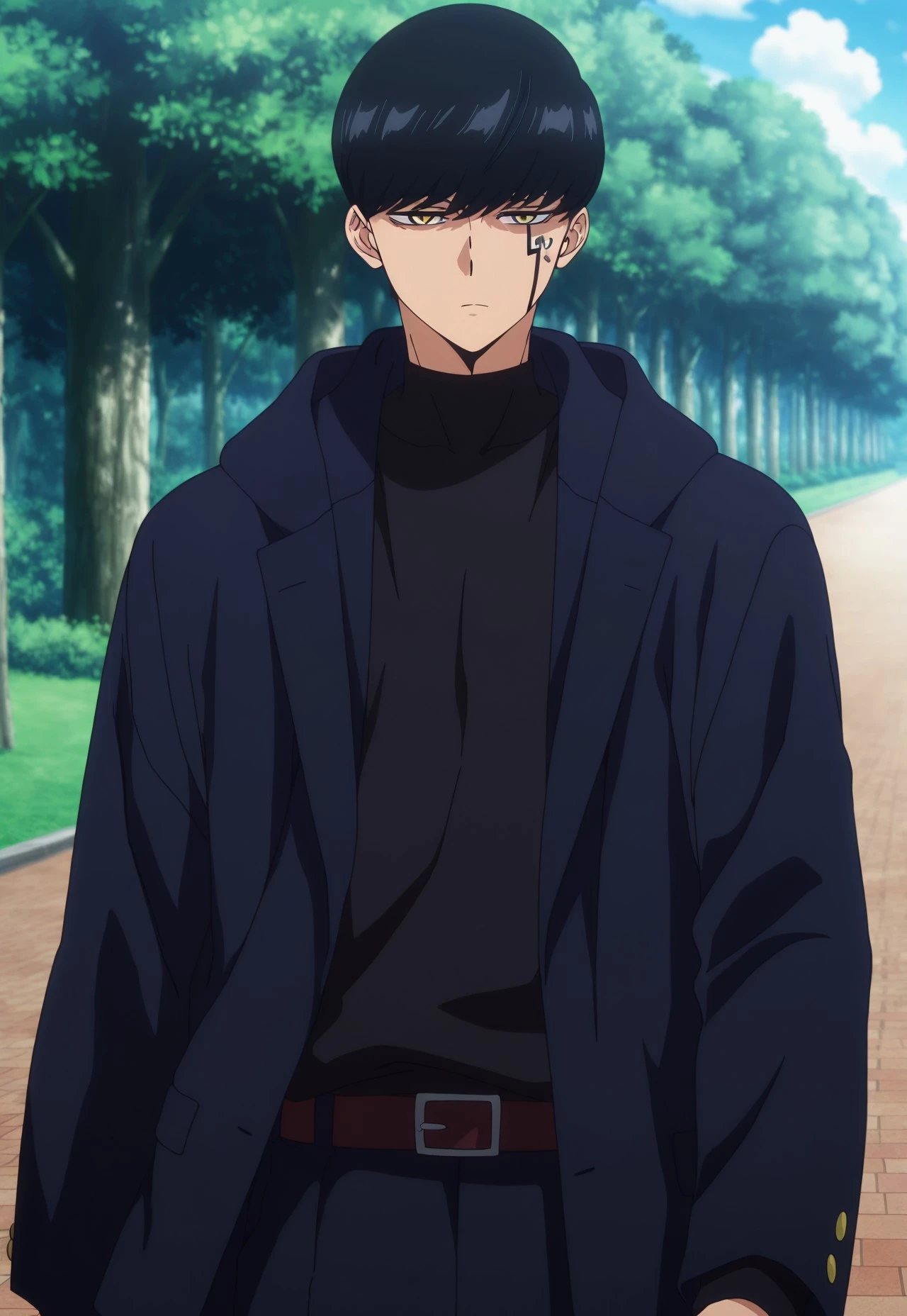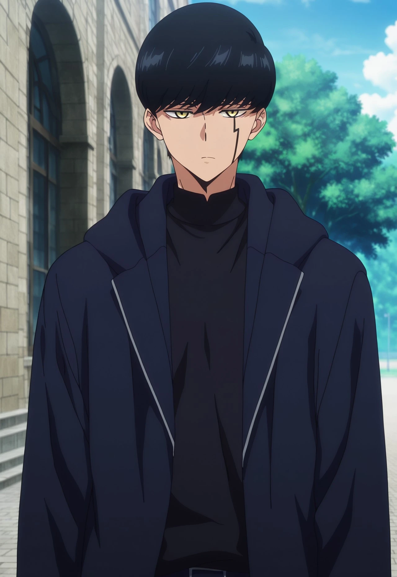 Mash, black hair, yellow eyes, face marking