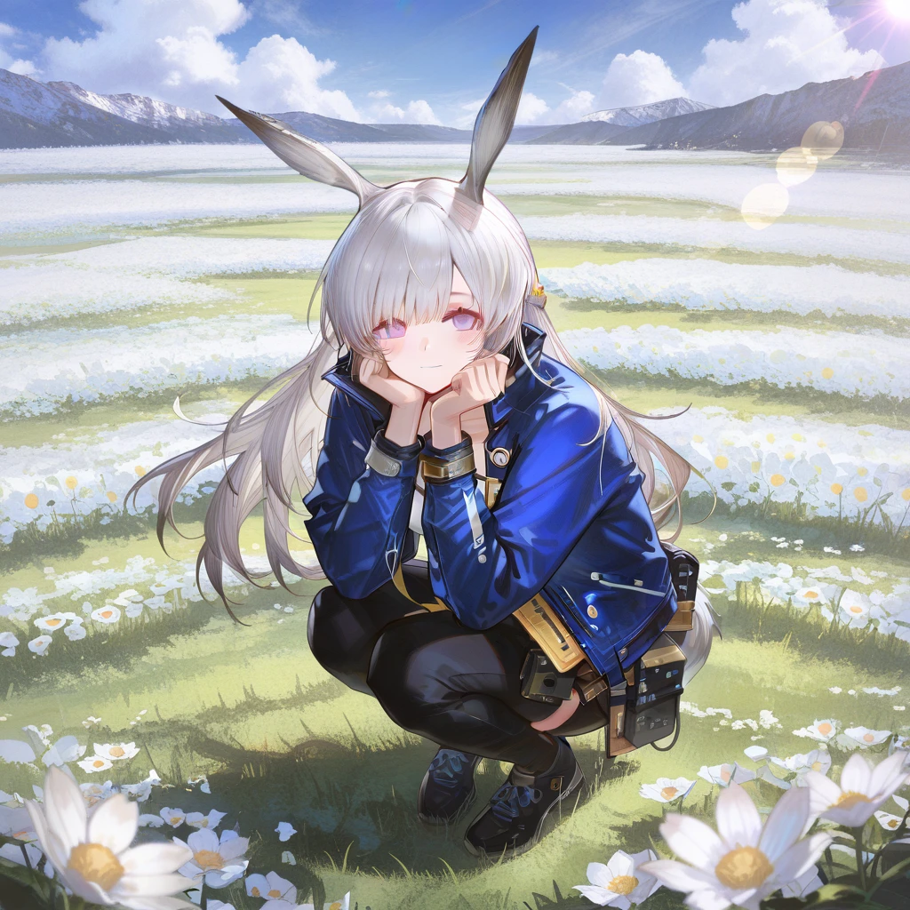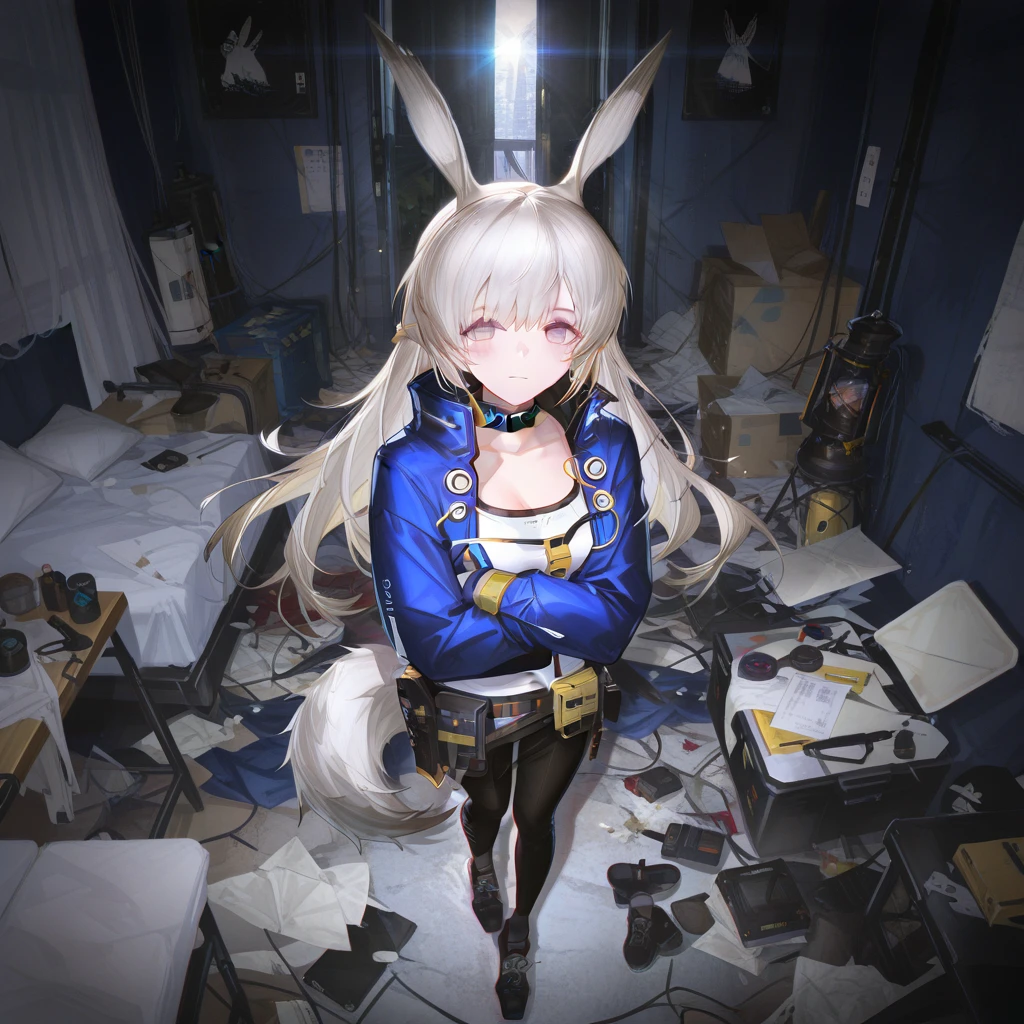 Body: animal ears, long hair, white hair, tail, squirrel tail, purple eyes, gray eyes