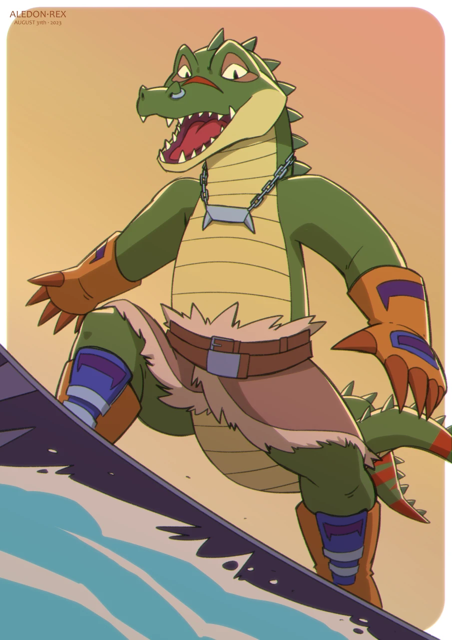 reptile, green scales, no fur, red eyes, thick black eyebrows, muscular arms, strong legs, long tail, sharp teeth, scar over left eye, confident smirk, orange gloves, blue and orange snowboard boots, fur-lined brown shorts, red belt, bandage on left arm,