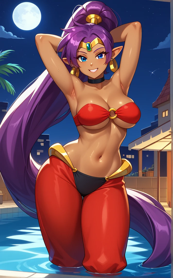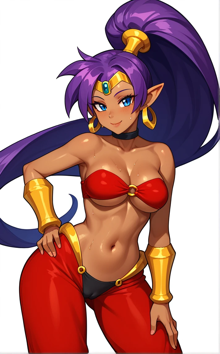 PONYXL_Shantae_ownwaifu, 1girl, ????, ???????, ?????, blue eyes, circlet, dark skin, dark-skinned female, gold, high ponytail, purple hair, shantae, vambraces, pointy ears, jewelry, hoop earrings, tiara, medium breasts, big hair, bracer, navel, collarbone, forehead jewel, black choker, long hair, lips, shiny hair, wide hips, narrow waist, bangs, colored skin, makeup, very long hair, gem, ⚙️My Settings: I use 4xUpscaler because its clean and fast, for best results dont mix multiple LoRAs and try different LoRA weights for optimal results. Change Clip 2 for Anime and Clip 1 for everything else.