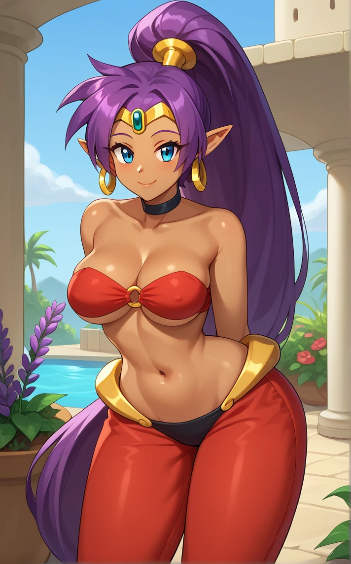 PONYXL_Shantae_ownwaifu, 1girl, blue eyes, circlet, dark skin, dark-skinned female, gold, harem pants, high ponytail, lowleg pants, bare shoulders, midriff, purple hair, red bandeau, red pants, shantae, vambraces, pointy ears, jewelry, hoop earrings, tiara, medium breasts, big hair, cleavage, bracer, navel, arabian clothes, o-ring top, collarbone, forehead jewel, black choker, long hair, underboob, lips, shiny hair, wide hips, narrow waist, bangs, colored skin, strapless, makeup, very long hair, gem,