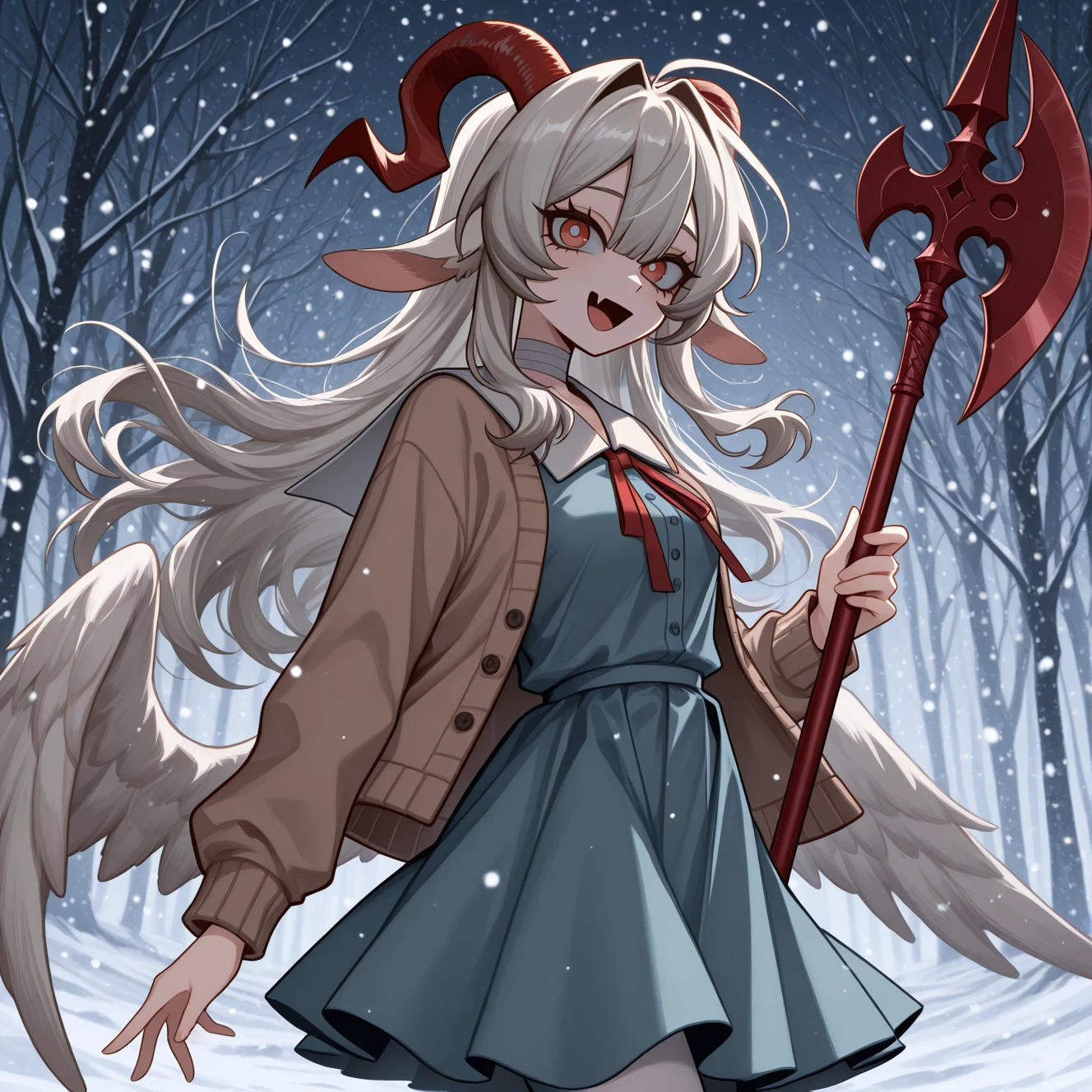 hannah \(populamalus)\, animal ears, red horns, goat horns, goat girl, curled horns, goat ears, white hair, long hair, hair intakes, sidelocks, hair between eyes, red eyes, white pupils, goat tail, white tailAngel Appearance