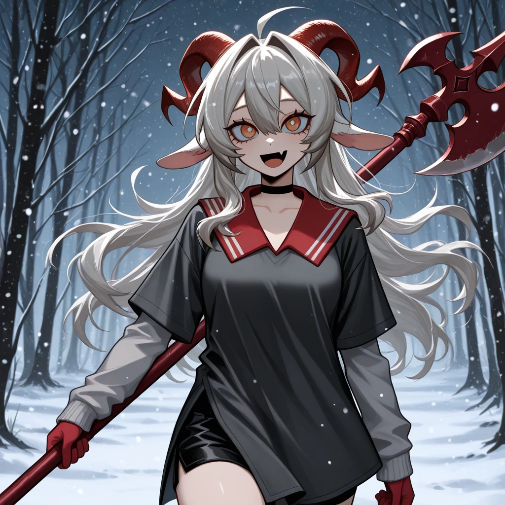 hannah \(populamalus)\, animal ears, red horns, goat horns, goat girl, curled horns, goat ears, white hair, long hair, hair intakes, sidelocks, hair between eyes, red eyes, white pupils, goat tail, white tail