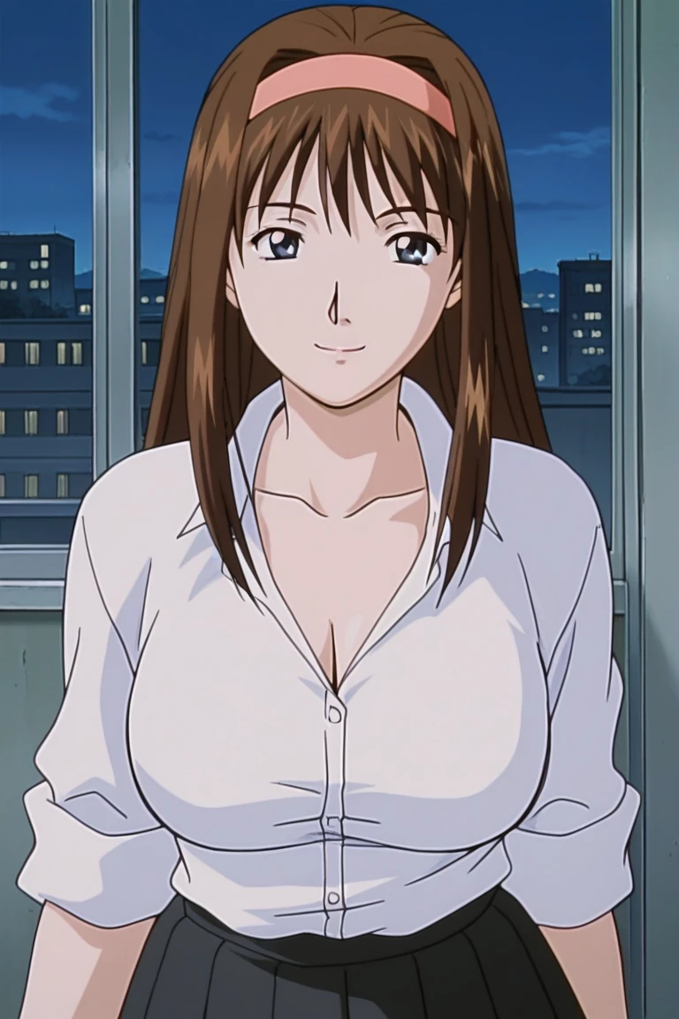 gto_style, gto_for_tomoko_nomura, 1990s \(style\), retro artstyle, blue eyes, brown hair, long hair, large breasts,collarbone, covered navel, cleavage, smile, hairband, white shirt, black pleated skirt