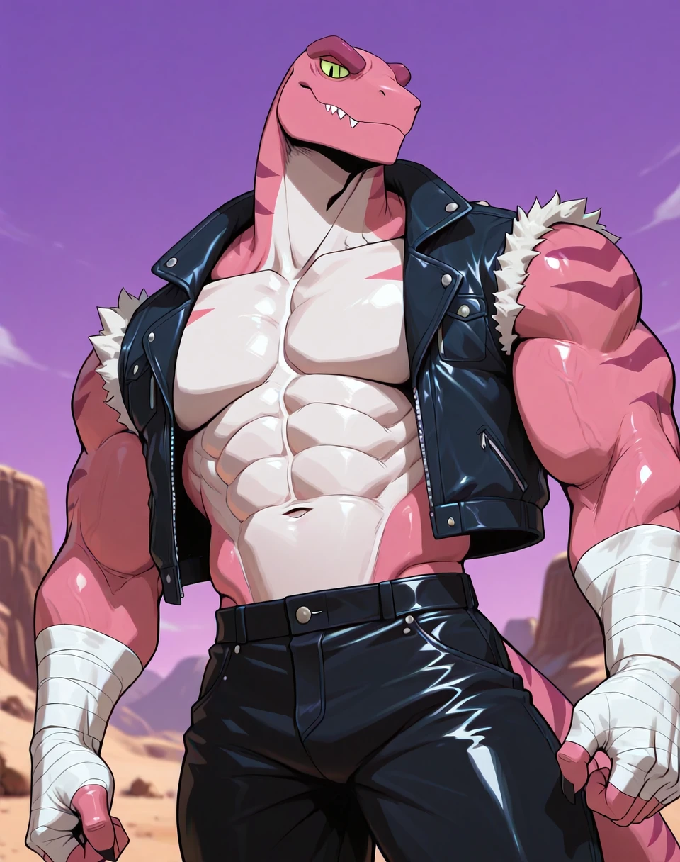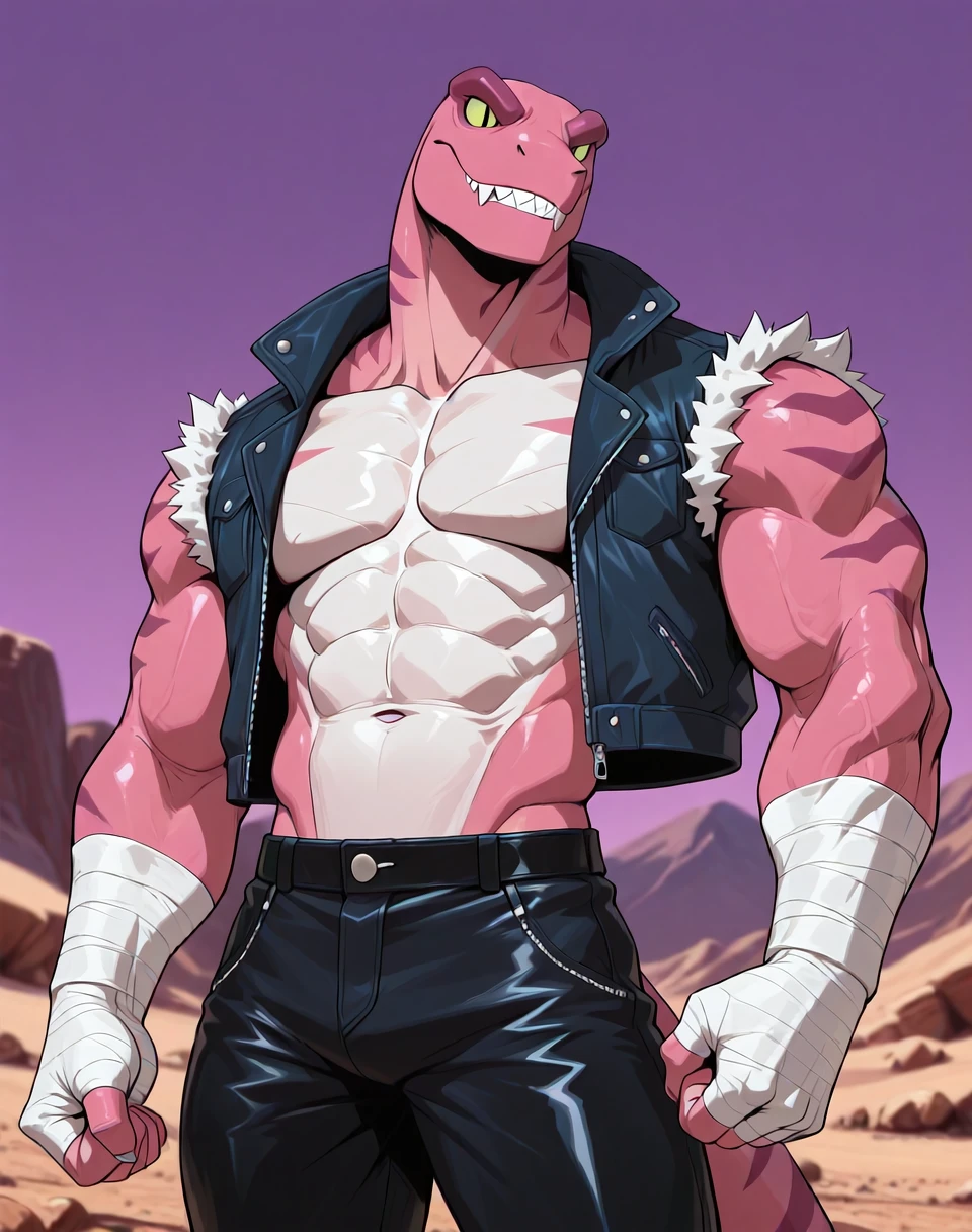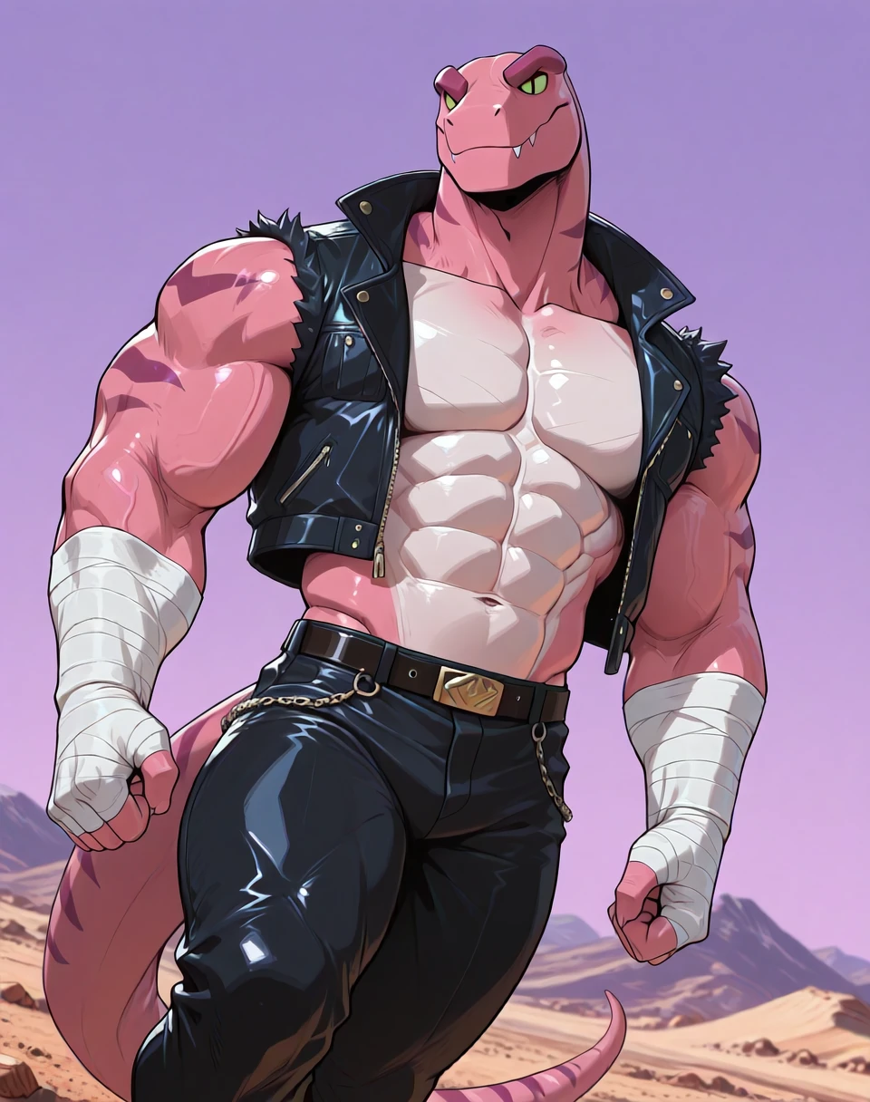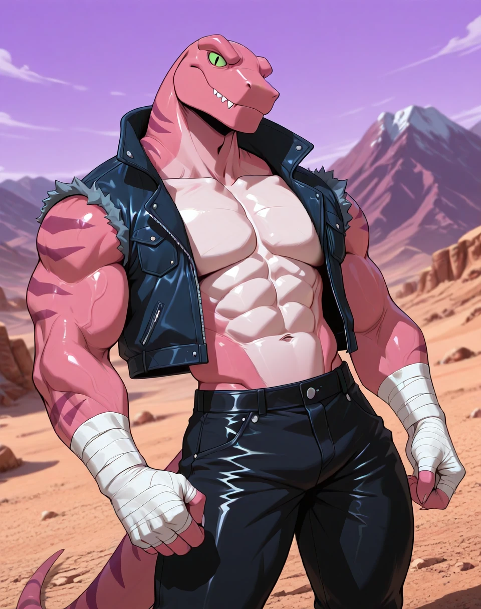 Prompts for this lora are ( TunLas, muscular, reptile, ). It would help to make the character by adding the prompts ( pink red body, green eyes, ). He also wears a sleeveless leather jacket vest, hand wraps, leather pants, leather boots, and has an overall subtle cowboy look in his outfit. As such, if one wants an accurate look, prompt accordingly.