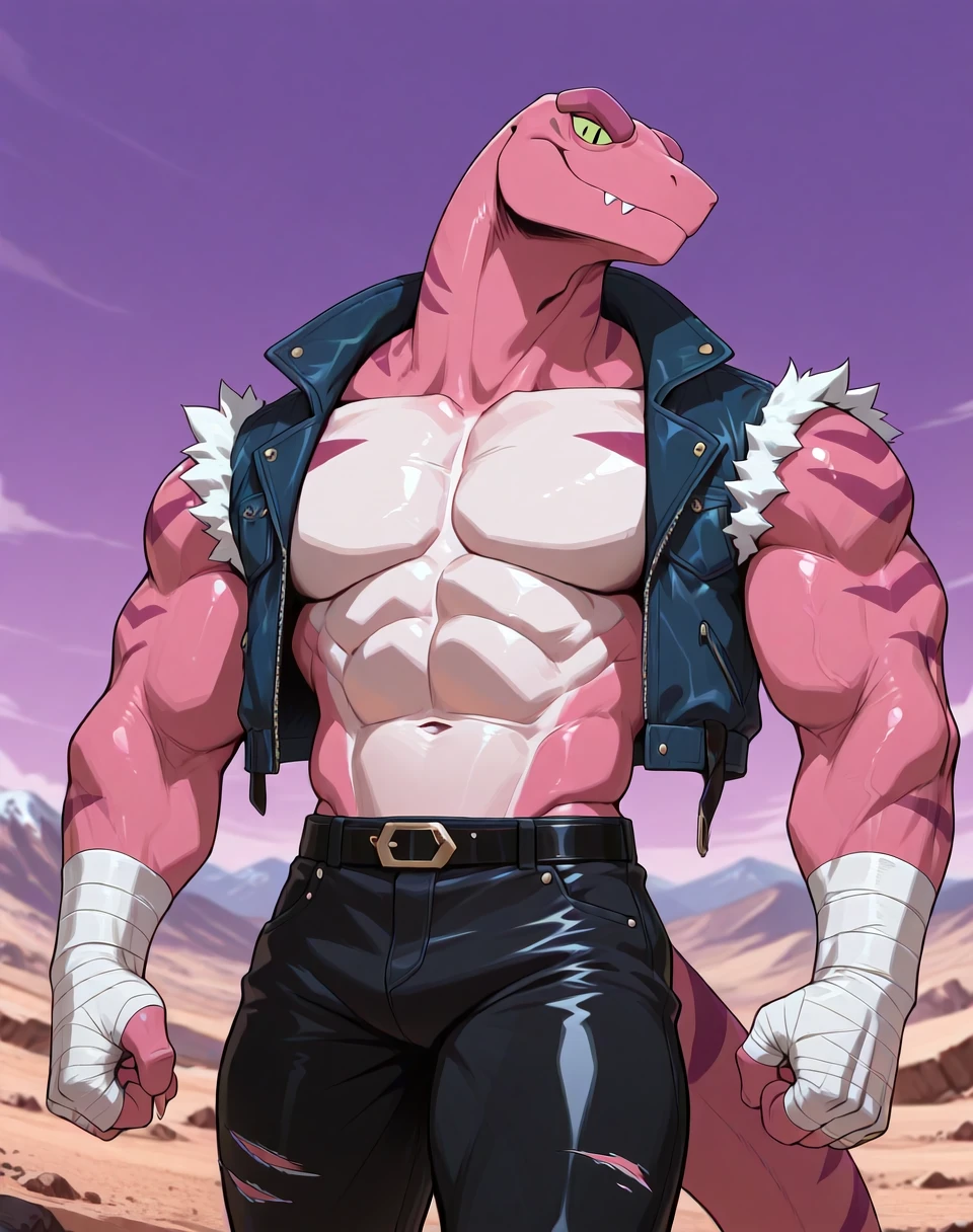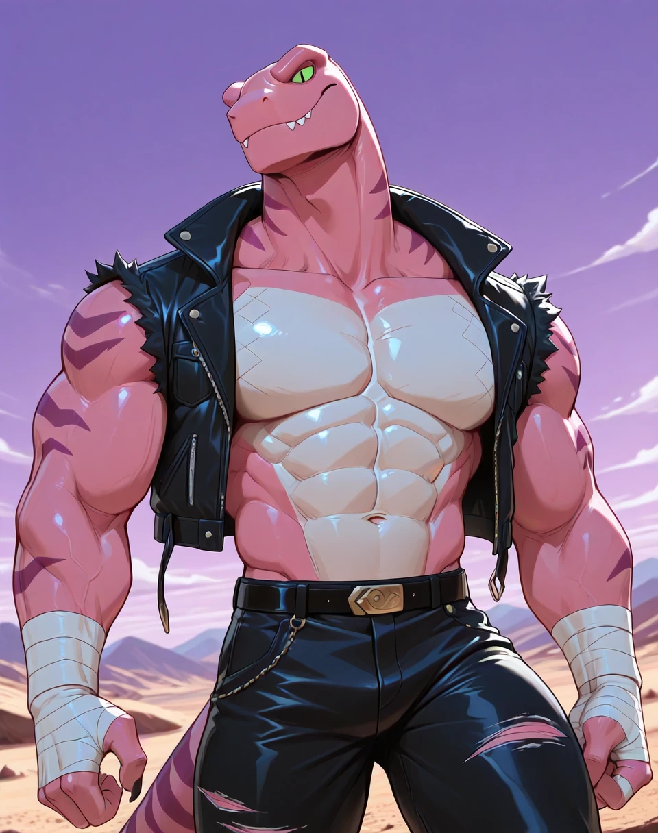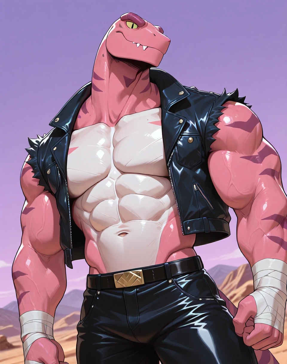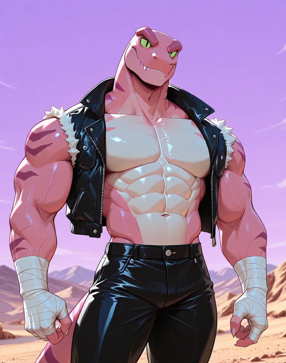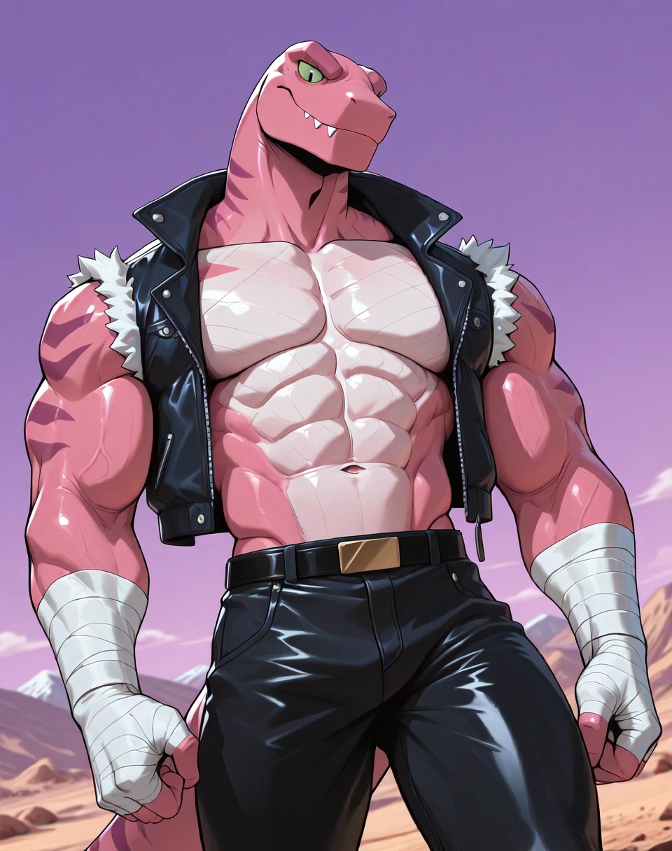 Prompts for this lora are ( TunLas, muscular, reptile, ). It would help to make the character by adding the prompts ( pink red body, green eyes, ). He also wears a sleeveless leather jacket vest, hand wraps, leather pants, leather boots, and has an overall subtle cowboy look in his outfit. As such, if one wants an accurate look, prompt accordingly.