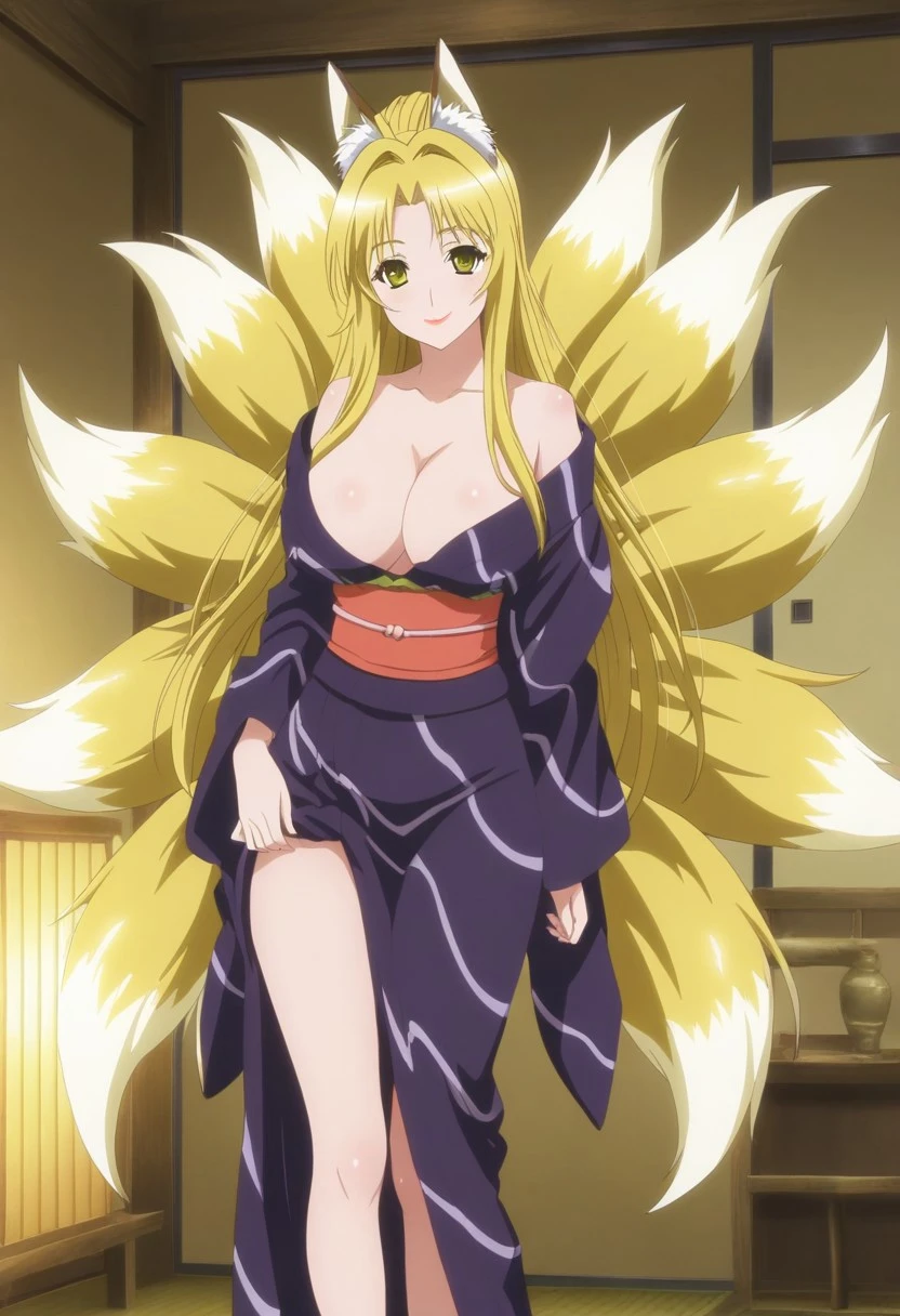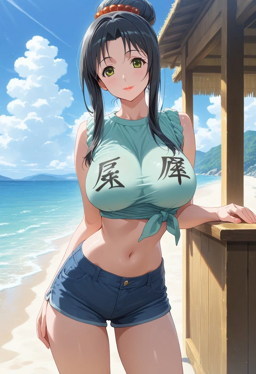 tamamo minamoto(Human), black hair, long hair, antenna hair, bangs, sidelocks, high ponytail, green eyes, hair tie, red lipstick, kimono, japanese clothes, heels, sash, large breasts, 1girl, solo 1girl, solo, minamoto tamamo(Fox), Blonde hair, fox ears, fox tails, Blue shorts, tied shirt, hair bun