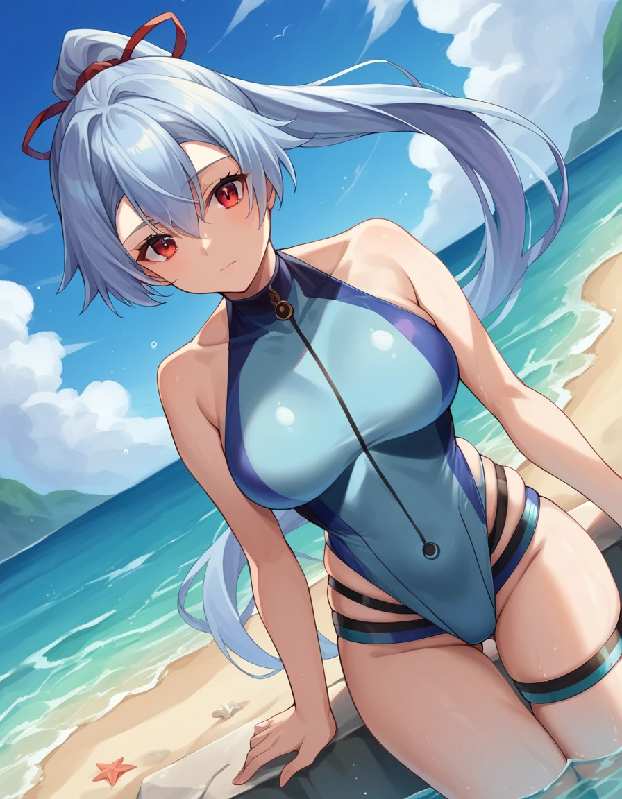 bare shoulders, blue one-piece swimsuit, hair ribbon, halterneck, navel, official alternate costume, one-piece swimsuit, skin tight, skindentation, swimsuit, thick thighs, thigh strap, thighs,