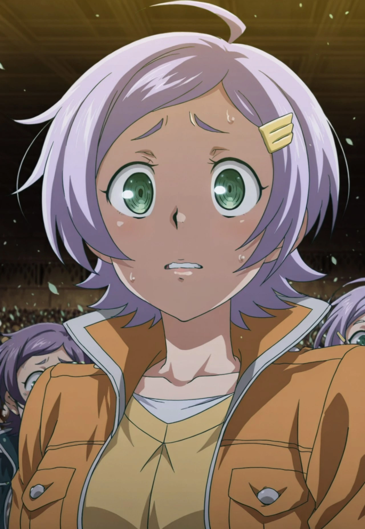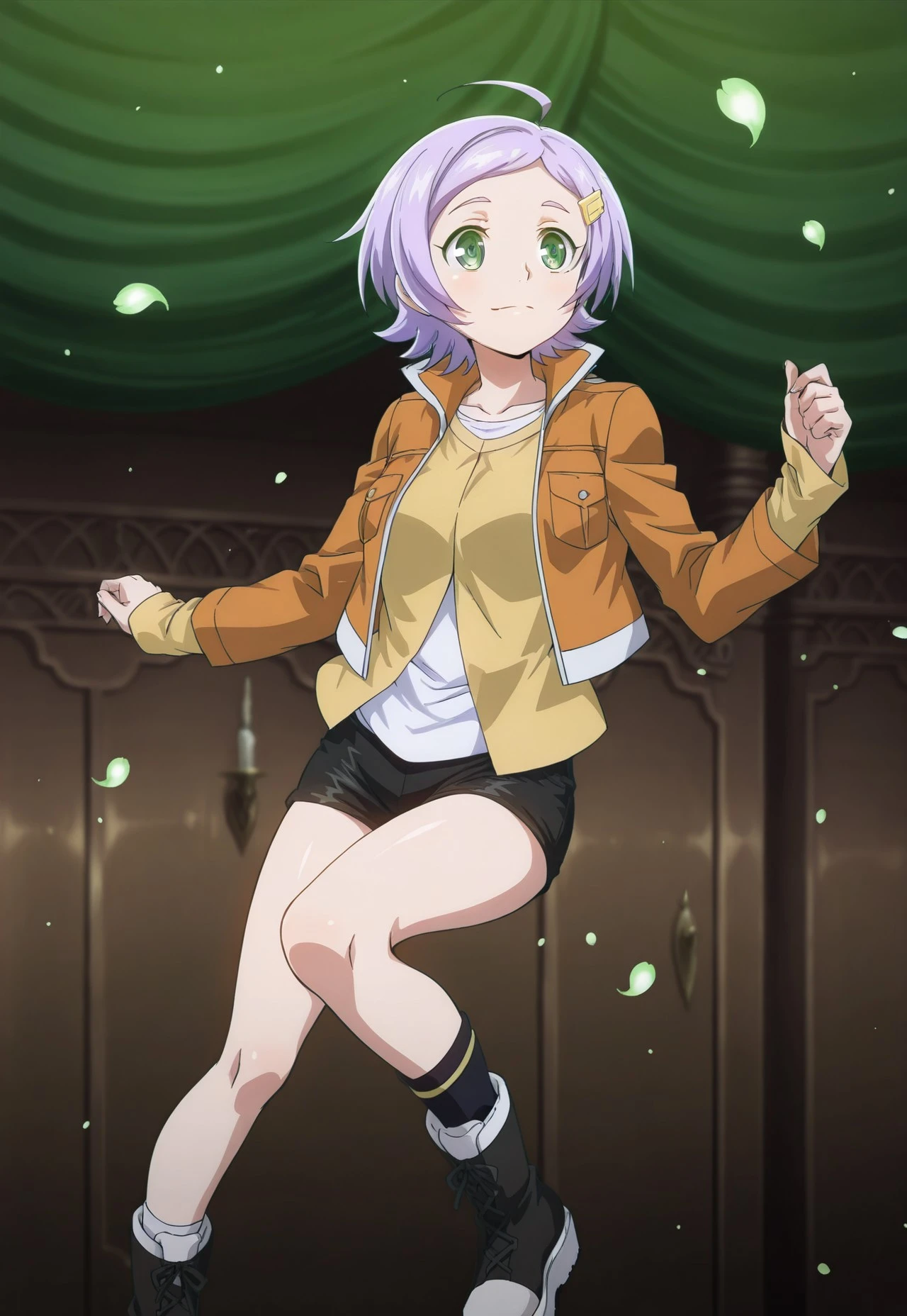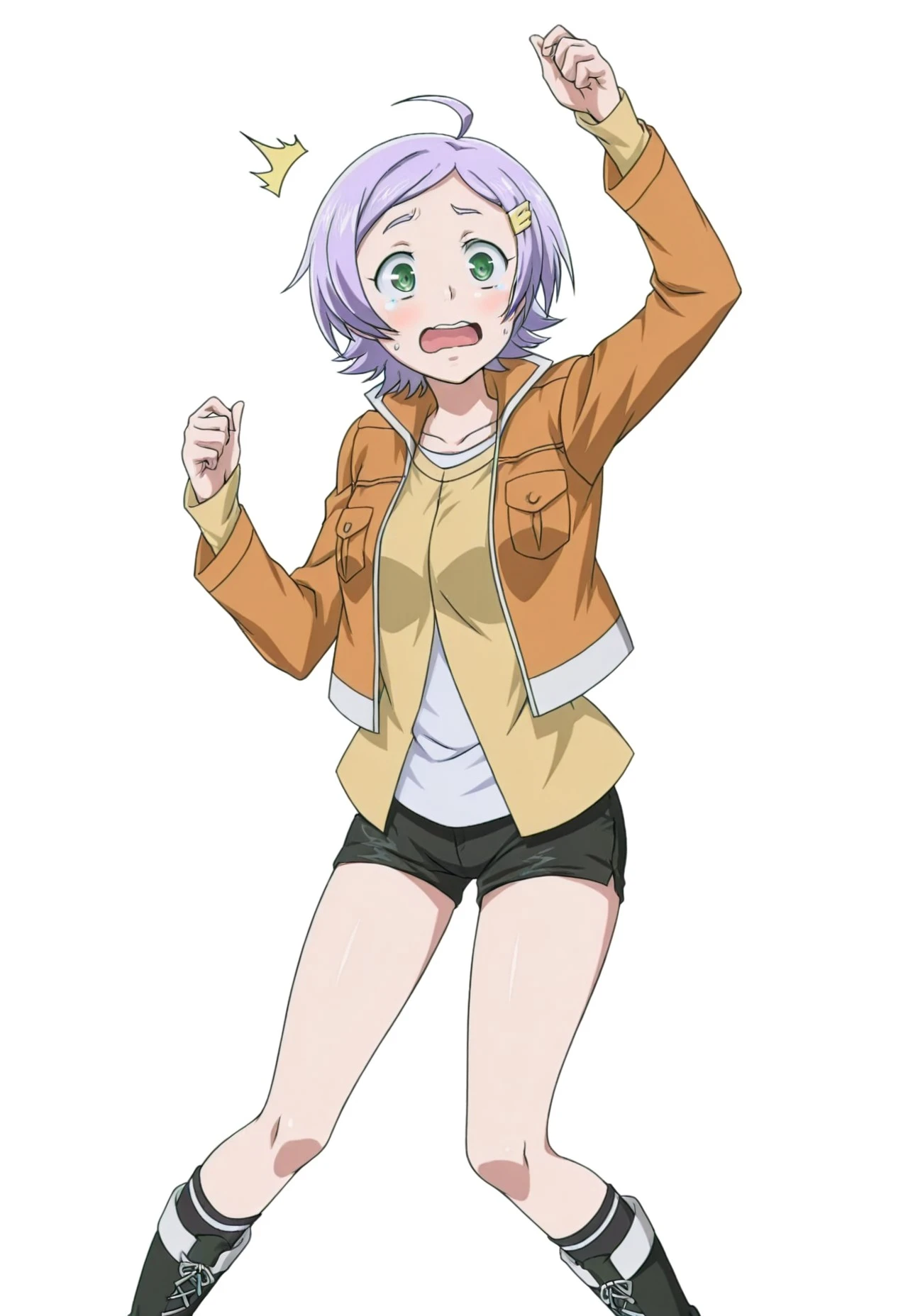 1girl, goll, short hair, purple hair, green eyes, yellow hairclip, orange jacket, open jacket, yellow shirt, white shirt underneath, black shorts, single long black sock, black boots