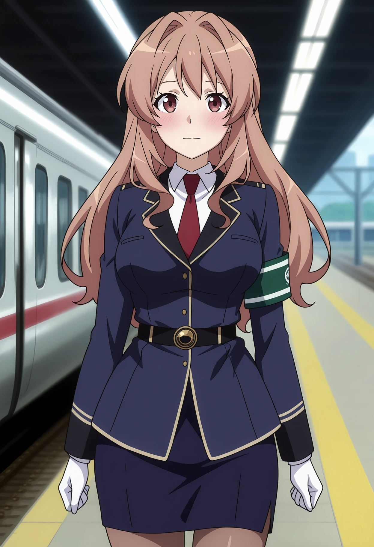 blue jacket, white shirt, red necktie, green armband, white gloves, black belt, pencil skirt, blue skirt, brown pantyhose