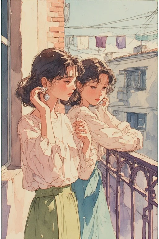 Prompt: (watercolor anime:1.2), twin Japanese sisters, 22 years old, wearing elegant kimonos, delicate features, soft expressions, cherry blossoms in background, warm spring light, harmonious pastel colors, wet‑in‑wet background, refined fabric details, cold press paper texture, masterpiece, best qualityMan thinking about the future