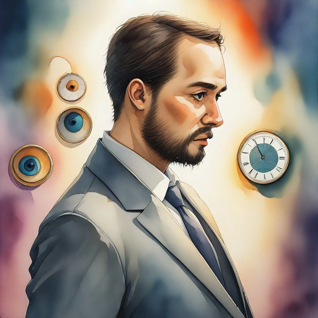 Prompt: (watercolor anime:1.2), mature man dressed in a modern suit, contemplative expression, looking towards the horizon, soft lighting, thoughtful atmosphere, abstract background with subtle hints of clocks or pathways, granulated shadows, elegant, cold press paper texture, loose brushwork, masterpiece, best qualityKoi fish underwater