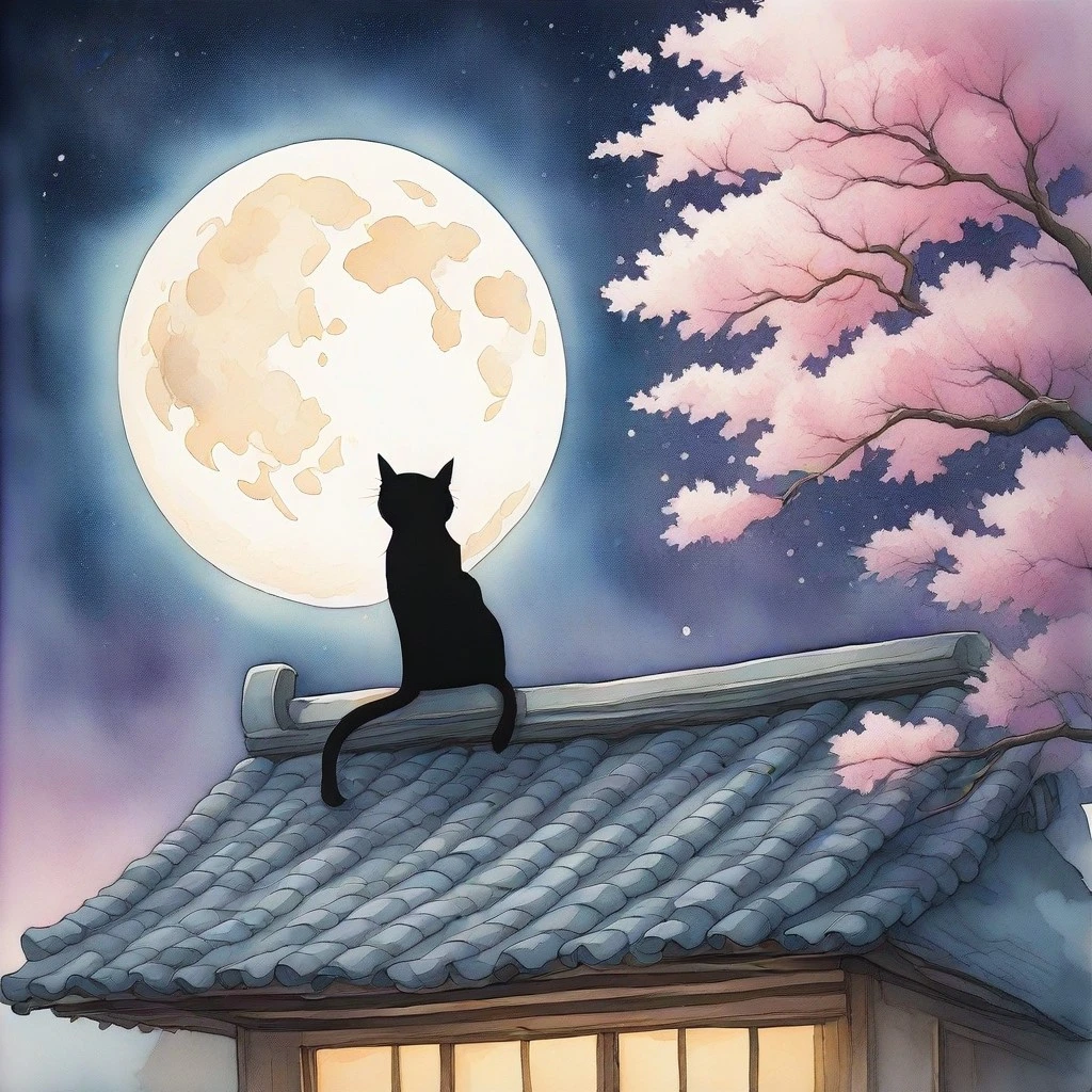 Prompt: (watercolor anime:1.2), black cat sitting on a rooftop, silhouette against a full moon, night sky with deep blues and indigos, glowing moon, soft stars, moody atmosphere, granulated sky, wet‑on‑wet background, cold press paper texture, loose brushwork, color bleeding, masterpiece, best qualityJapanese twins in kimono