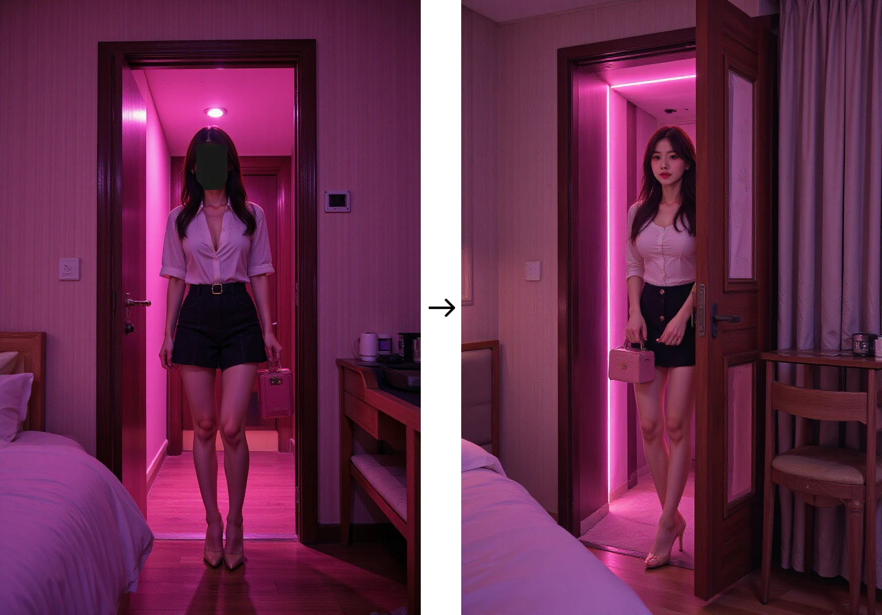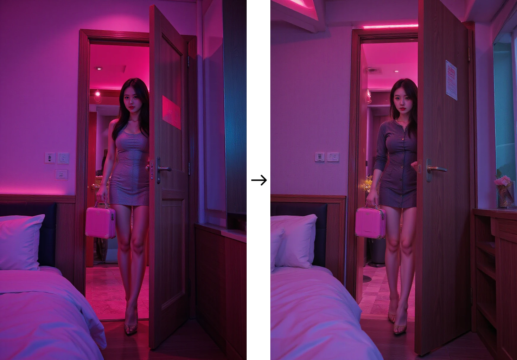 A hotel neon lits room scene with a half-open door, revealing a girl.