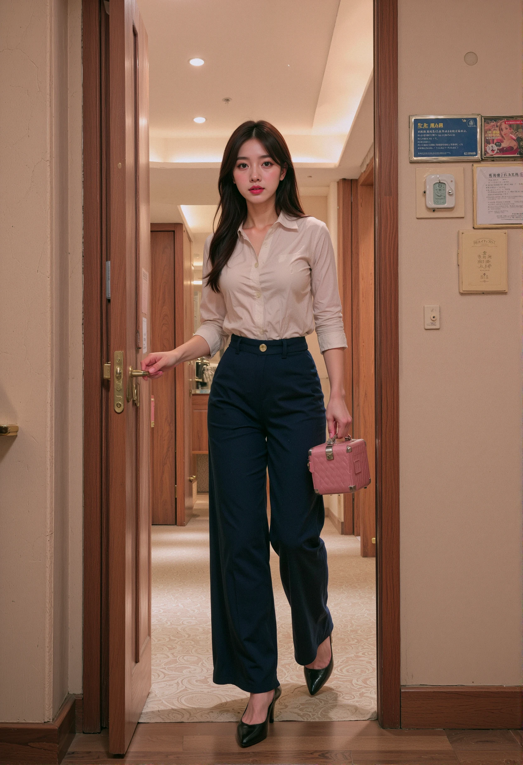 eye-level shot, hotel_door_entry, young woman standing at a doorway, pushing open door,stepping into doorway,facing to viewer, hotel hallway visible through doorway,