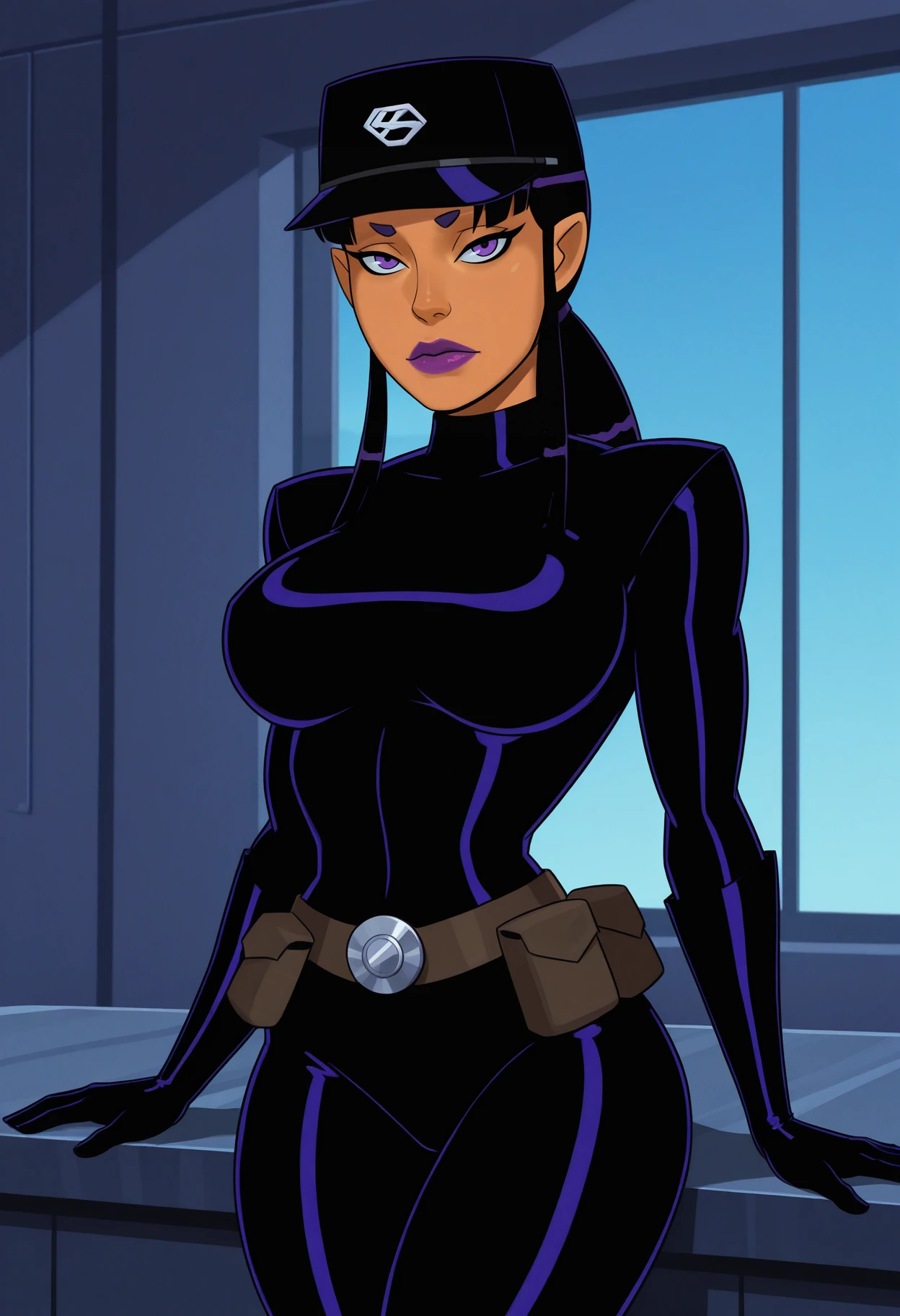 ponytail, blackfire_uniform_outfit, hat, uniform, military, military uniform, bodysuit, black bodysuit, gloves, black gloves, belt, superhero outfit tags: