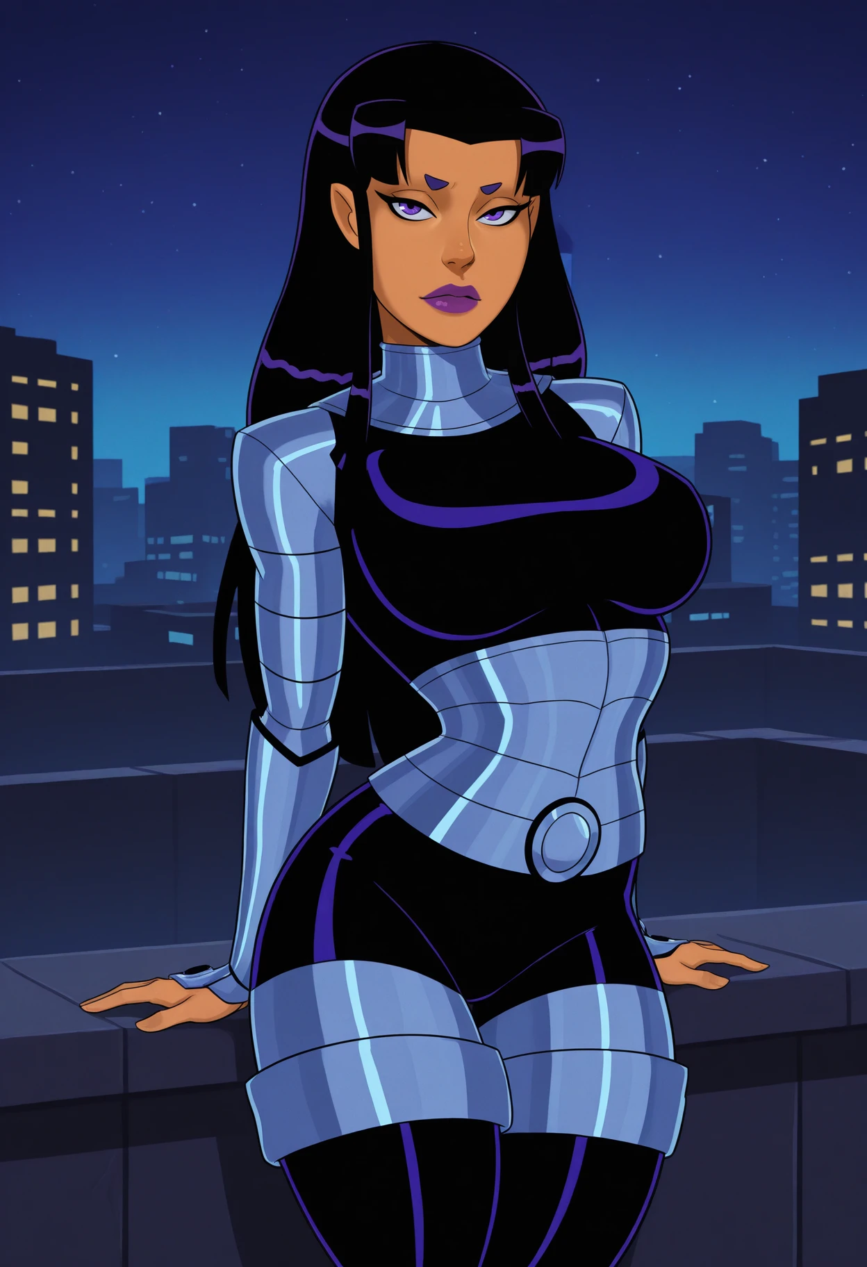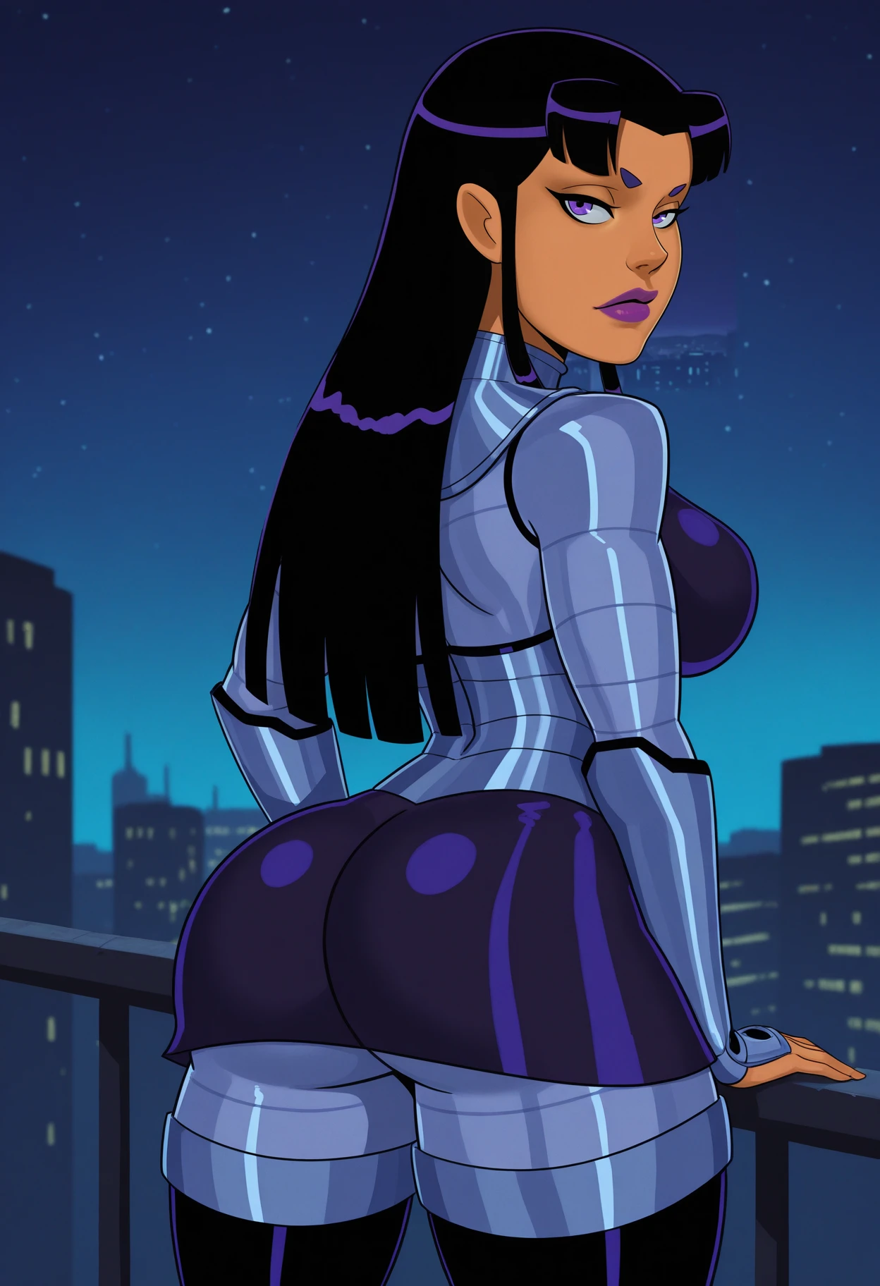 blackfire_hero_outfit, gorget, armor, bodysuit, shirt, thighhighs, You can support my work by following the link: https://boosty.to/nmackelie
