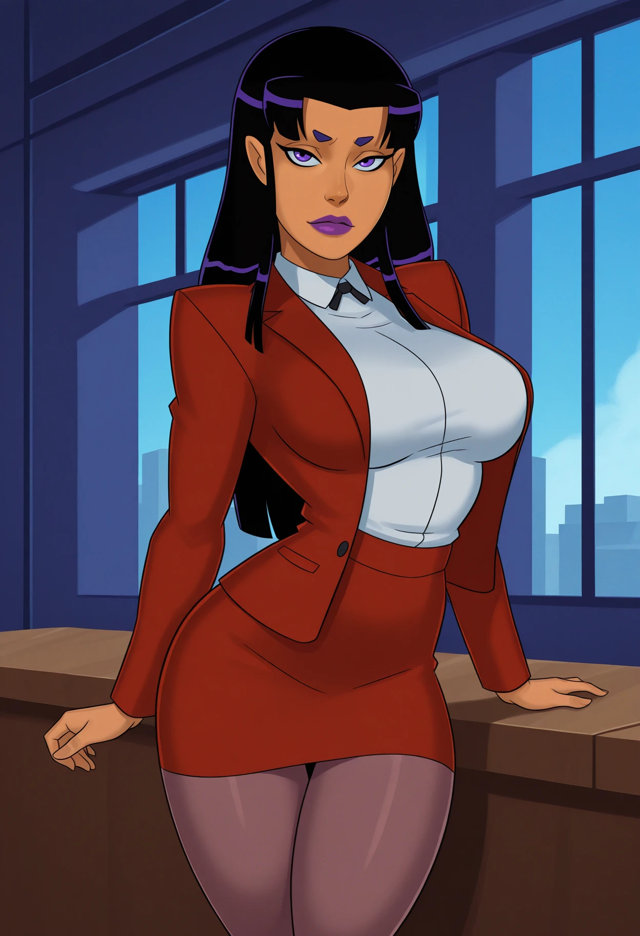 blackfire_costume_outfit, formal, suit, jacket, red jacket, shirt, skirt, red skirt, pencil skirt, pantyhose,
