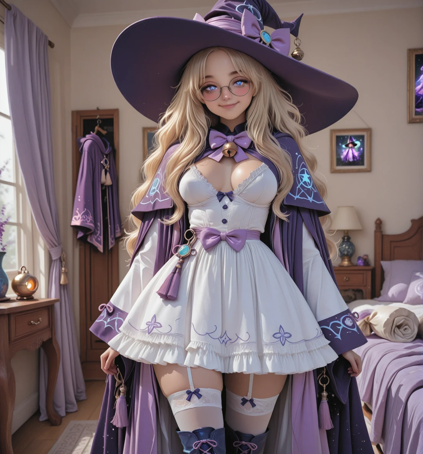 Chang'e-witch, , blonde hair, long wavy hair,large blue eyes,sparkling eyes,round glasses,wizard outfit,white dress,purple sorcerer's sack with bell sleevespurple witch hat with tassel,purple blue robe cape,cyan bow tie,,white frills, white stockings, blue boots