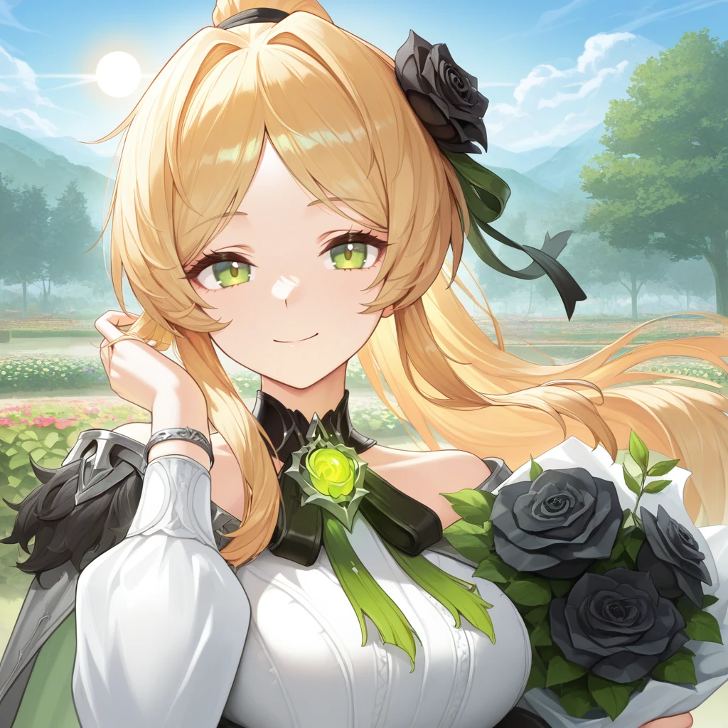 DaphneDNA, blonde hair, sidelocks, ponytail, black rose, black ribbon, hair ribbon, hair flower, green eyes, long hair,Character Prompts are included in each Outfit.